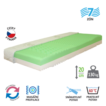 Produktcode: 8806Massageprofile mit unterschiedlichen Seitenstärken, Flexifoam-Schaumkern die Oberfläche ist beidseitig in 7 anatomische Zonen profiliert harte (weiße) und weiche (hellgrüne) Seite geeignet für alle Arten von Gitterrosten für Allergiker geeignet, Bezug abnehmbar und waschbar bis 60 °C empfohlene Belastbarkeit bis zu 130 kg