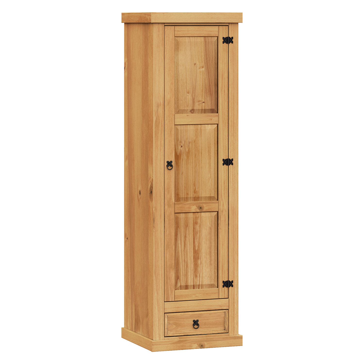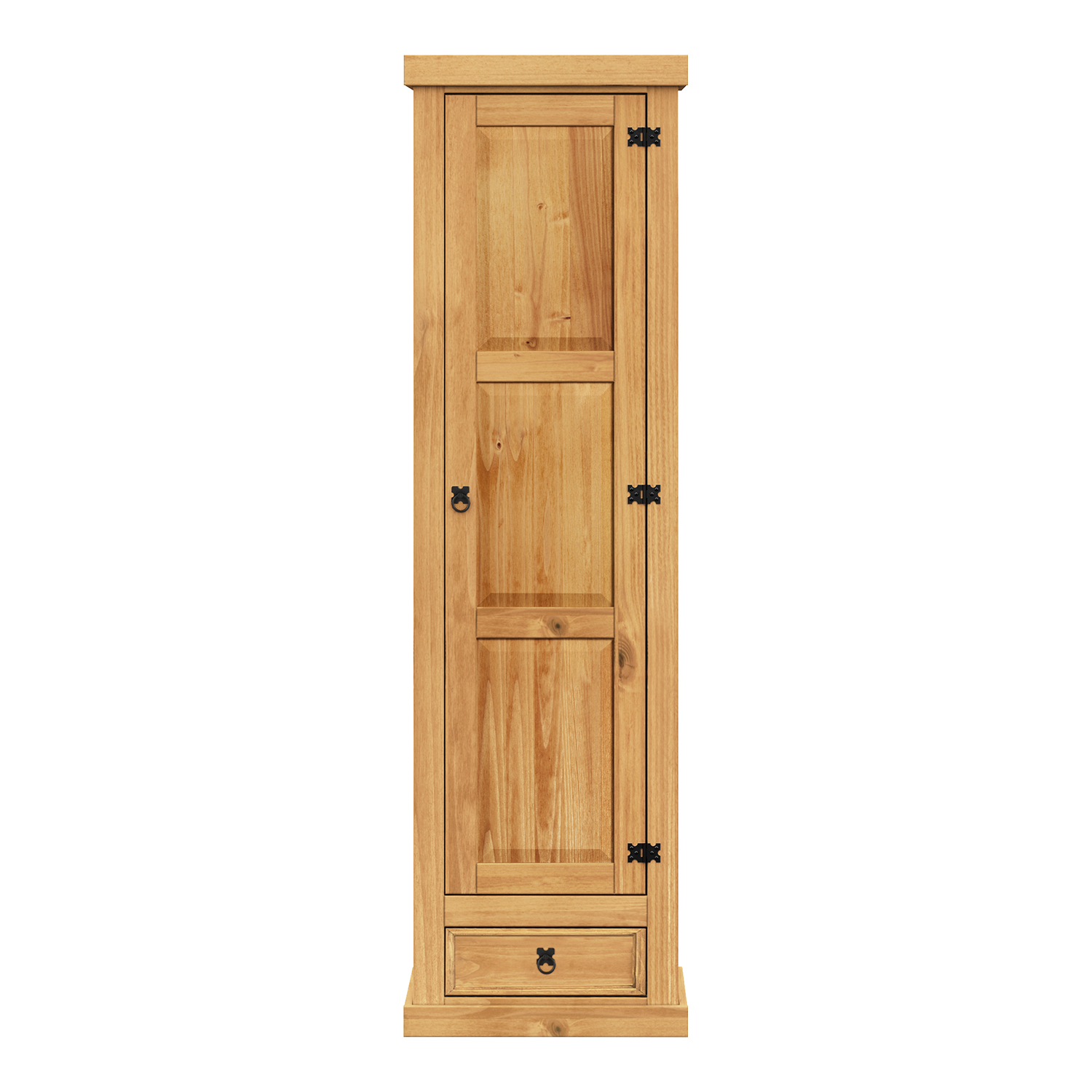 Produktcode: 162818Material massives Kiefernholz gewachst in HonigtonKleiderschrank mit Garderobenstange und Hutablagegroße Schublade am Boden, dekorative Metallgriffeempfohlene Erweiterung CORONA 16951 Teil des Corona-Sets