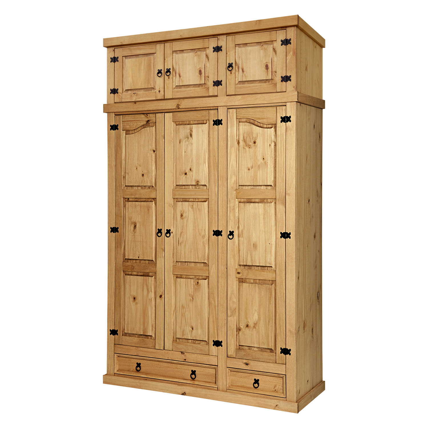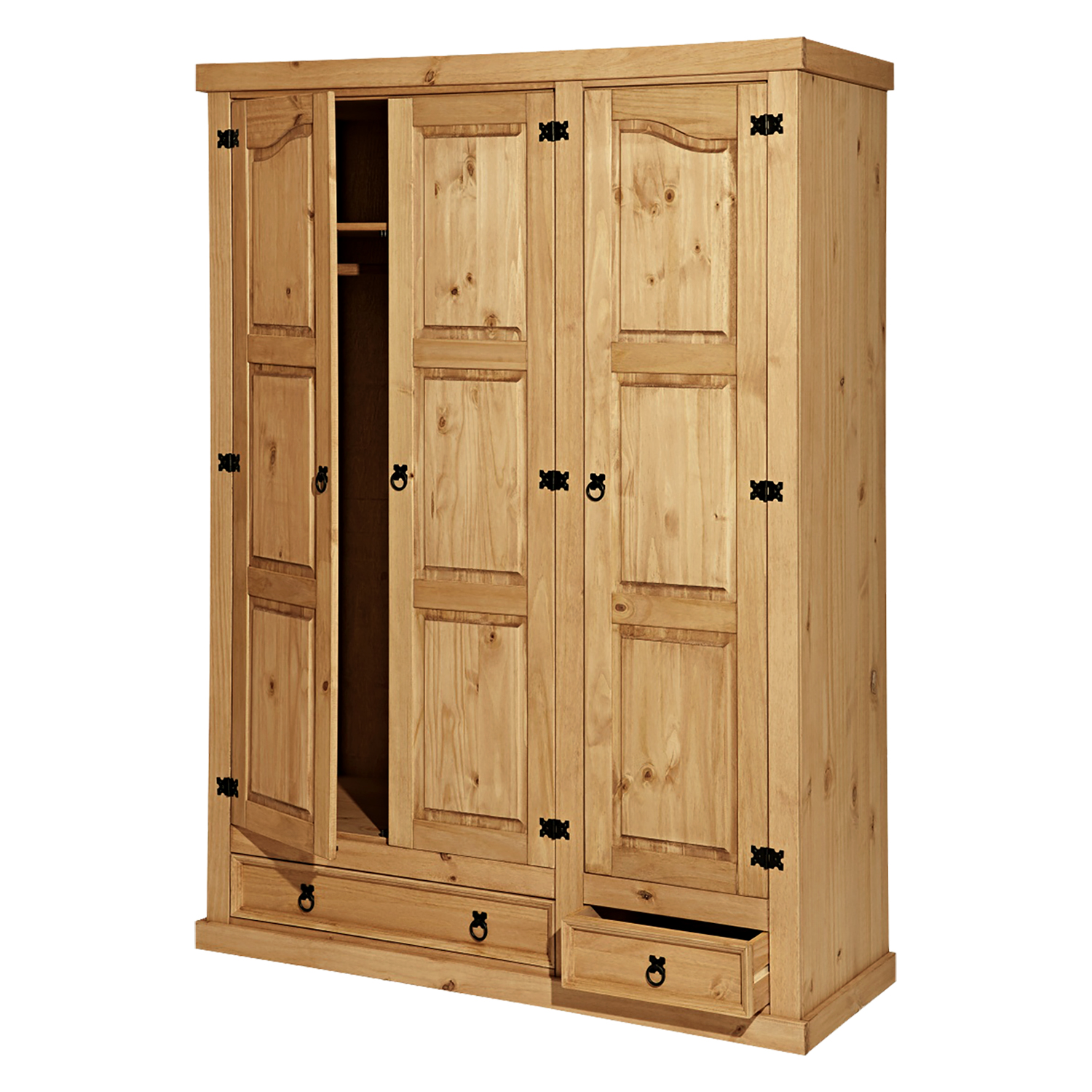 Erliegen Sie dem Charme der rustikalen Möbel mit dem Label CORONA. CORONA-Möbel werden in Ihrem Schlafzimmer immer perfekt aussehen. Der 3-türige Kleiderschrank CORONA aus massiver Kiefer ist eine schöne Ergänzung zu den anderen Möbeln in Ihrem Schlafzimmer. Der große Kleiderschrank ist im Verhältnis 2:1 unterteilt, mit einer Kleiderstange und Einlegeböden im breiteren Teil und drei Einlegeböden im schmaleren Teil. Im unteren Teil werden Sie sicherlich eine große und eine kleine Schublade verwenden. Auf diese Weise können Sie all Ihre Kleidung in dem massiven Kleiderschrank unterbringen. Die perfekte honigfarbene Wachsung und verspielte Details in Form von schwarzen Beschlägen und Griffen geben diesem Schrank einen unverwechselbaren Look. Mit CORONA-Möbeln können Sie Ihr ganzes Schlafzimmer, aber auch einen Raum in Ihrem Ferienhaus oder Ihrer Hütte einrichten. Der dreitürige Kleiderschrank überzeugt nicht nur durch seinen großzügigen Stauraum, sondern auch durch sein originelles Design und seine einzigartige Qualität. Lassen Sie ein Stückchen Landleben in das moderne Wohnen einziehen, denn jeder hat einen schönen Kleiderschrank verdient.