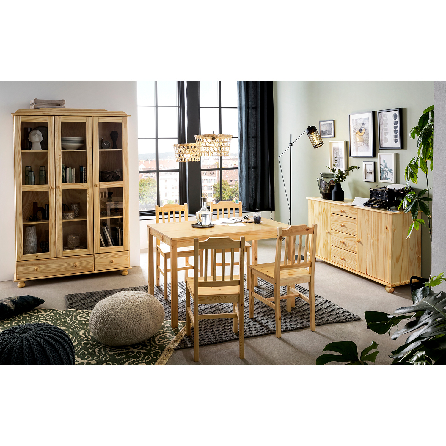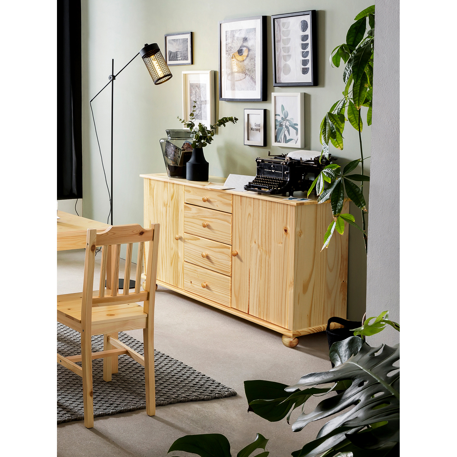 Das Sideboard-Set ist ein ehrliches Möbelstück, das sich nicht aufdrängt und dennoch die Aufmerksamkeit auf sich zieht. Es ist aus massivem Kiefernholz gefertigt und mit einer Lackierung versehen, die die Pflege einfach macht und das Holz vor der täglichen Abnutzung schützt. Dank des Klarlacks wirkt es frisch und sauber und behält dabei seine natürliche Struktur und sein authentisches Muster. Dieses Set ist so konzipiert, dass es in der Praxis funktioniert, aber nicht wie ein bloßes Reinigungswerkzeug aussieht. Auf der Oberseite befindet sich ein verschließbares Fach, in dem Sie Keramikgeschirr, Gläser oder Dekorationen, die Sie geschützt, aber sichtbar aufbewahren möchten, unterbringen können. Innen liegende Einlegeböden helfen, Ordnung zu halten und den Platz effizient zu nutzen. Der untere Teil des Sets bietet zusätzlichen Stauraum für Dinge, die Sie versteckt halten möchten - Tischdecken, Besteck oder kleine Küchengeräte. Schubladen bieten Platz für die Dinge, die man immer griffbereit haben möchte. Alle Teile werden durch Metallschienen ruhig und leise gehalten. Die Abmessungen der Baugruppe reichen aus, um alle gängigen Gegenstände im Esszimmer und in der Küche unterzubringen, und sind dennoch genau richtig für mittlere und kleinere Räume. Sie lässt sich auch mit verschiedenen Stilen kombinieren, von skandinavisch bis klassisch. Es fügt sich mühelos in einen Raum ein und bringt Ordnung und Ruhe in ihn. Dieses Sideboard ist keine exzentrische Dekoration. Es ist ein verlässlicher Verbündeter für ein Haus, das ein übersichtliches System haben möchte.