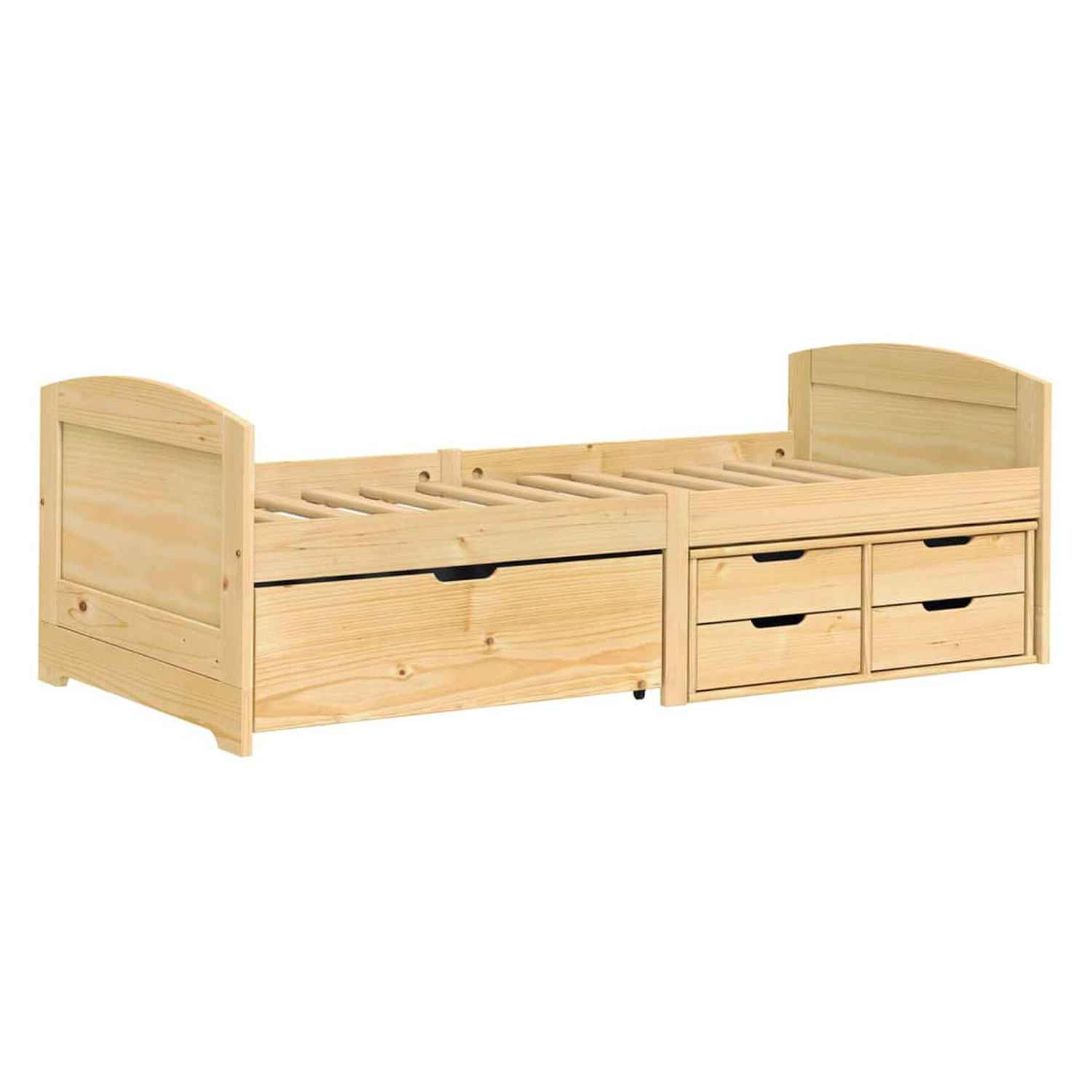 Das Einzelbett MARY mit lackierter Oberfläche ist ein ehrliches Möbelstück, das schon bei der ersten Benutzung Sinn macht. Es ist aus massivem Kiefernholz gefertigt, was ihm Festigkeit, Stabilität und Haltbarkeit verleiht. Die lackierte Oberfläche schützt das Holz vor Abnutzung und hebt seine natürliche Maserung subtil hervor, ohne sie zu unterdrücken. Das Design ist klar, es drängt sich nicht auf, beeindruckt aber dennoch durch die Qualität und Ruhe, die es in den Raum bringt. Unter der Liegefläche befinden sich 5 geräumige Schubladen, die als versteckter, aber sofort zugänglicher Stauraum dienen. Sie sind ideal für Bettzeug, saisonale Kleidung oder Spielzeug und ermöglichen es Ihnen, ohne zusätzliche Möbel Ordnung zu halten. Die Schubladen lassen sich ohne Kraftaufwand herausziehen und sind auch bei täglichem Gebrauch sehr robust, so dass sie ohne Probleme länger ihren Dienst tun. Das Bett ist mit einem Lattenrost ausgestattet, der die Matratze gut stützt und zu einem angenehmen Schlaf beiträgt. Die Matratze ist nicht im Lieferumfang enthalten, so dass Sie die richtige Matratze nach Ihren persönlichen Vorlieben und Bedürfnissen auswählen können. Das Einzelbett ist für eine Standardgröße von 90 × 200 cm ausgelegt, wodurch es sich leicht mit verschiedenen Matratzentypen kombinieren lässt. Die Gesamtabmessungen des Bettes stellen seine Benutzerfreundlichkeit in den Vordergrund. Es ist schlank genug, um auch in kleinere Räume zu passen, und bietet gleichzeitig ein vollwertiges Bett mit Stauraum. Das Einzelbett MARY ist eine gelungene Kombination aus Qualität, Schlichtheit und Nutzwert. Es sieht unscheinbar aus, aber im täglichen Gebrauch werden Sie seine Durchdachtheit und Langlebigkeit erkennen.