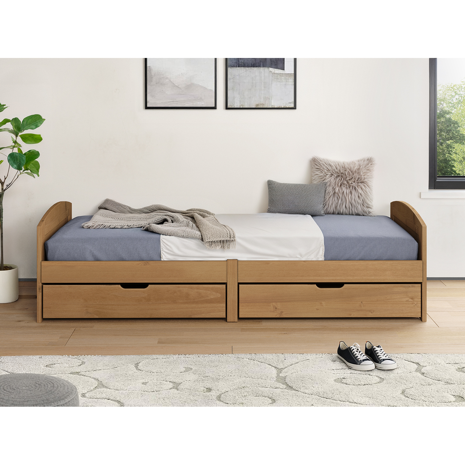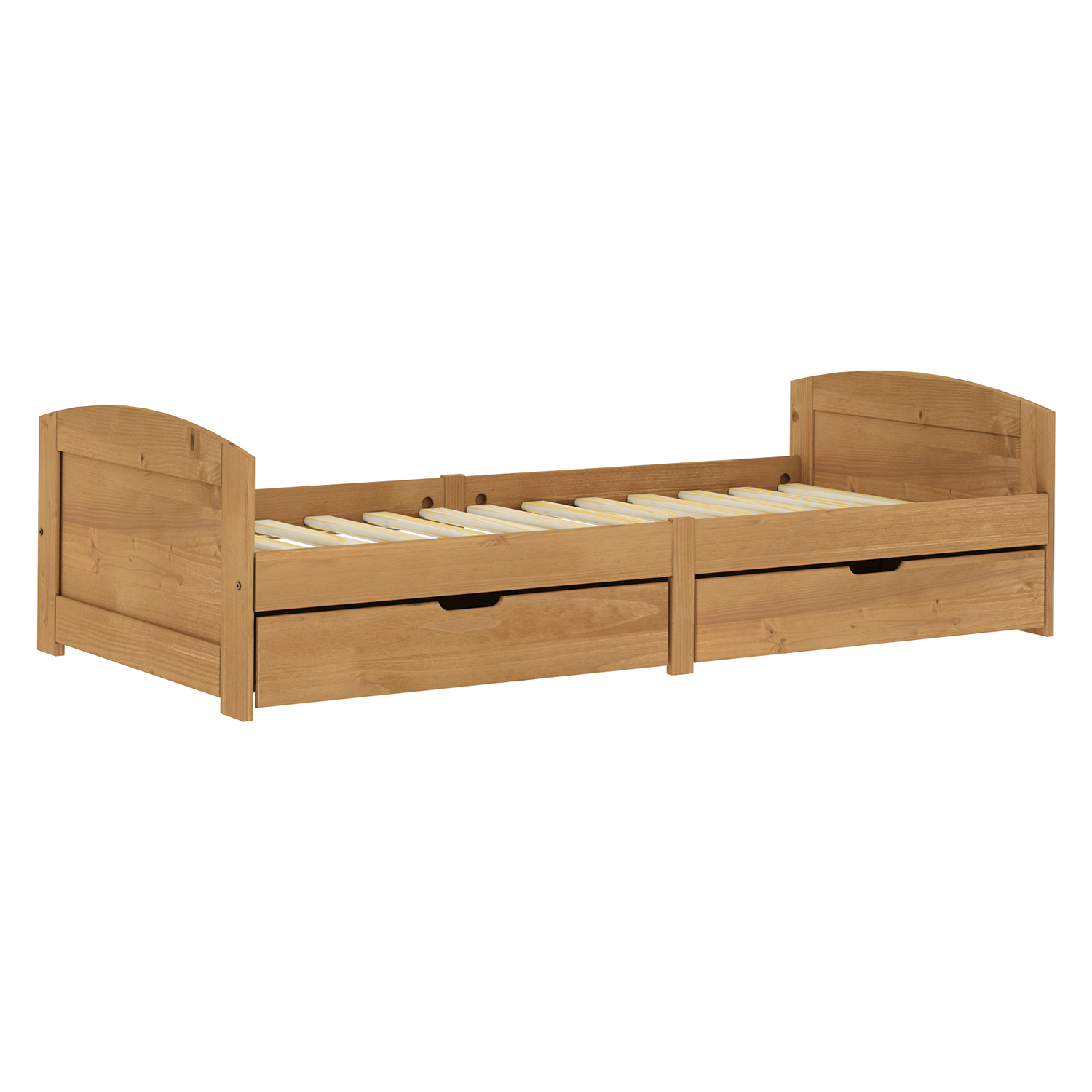 Das Einzelbett MARIA aus massiver Kiefer mit gewachster Oberfläche bringt klares Design, praktische Funktionalität und einen warmen, natürlichen Look in jedes Schlaf- oder Kinderzimmer. Mit seinem schlichten Stil wirkt es nicht überflüssig, sondern überzeugt durch seine Qualität und Durchdachtheit. Die gewachste Oberfläche hebt die subtilen Strukturen des Holzes hervor und verleiht dem Bett ein authentisches Aussehen, ohne dass komplizierte Effekte erforderlich sind. Außerdem schützt diese Behandlung das Material und macht es pflegeleicht, so dass das Möbel auch nach Jahren noch schön aussieht. Die Massivholzkonstruktion strahlt Stabilität, Stärke und Langlebigkeit aus. Die zwei mitgelieferten, beweglichen Schubladen auf Rollen sind praktisch und bieten wertvollen Stauraum. Sie lassen sich leicht herausziehen, was Sie im Alltag zu schätzen wissen werden, und sparen Platz, da Sie keine weitere Kommode oder Schrank benötigen. Das Bett ist außerdem mit einem hochwertigen Lattenrost ausgestattet, der von Anfang an für eine feste Matratzenauflage sorgt. Dadurch passt sich das Bett sehr gut an die individuellen Schlafbedürfnisse an, während Sie die Matratze nach Ihren Wünschen auswählen können. Die Matratze ist nicht im Lieferumfang enthalten, was Ihnen die Freiheit gibt, sie selbst zu wählen. Das Bett MARIA ist ein ehrliches Möbelstück, das unscheinbar aussieht, aber wenn Sie es benutzen, werden Sie sofort merken, wie gut es durchdacht ist. Es vereint Zweckmäßigkeit, Natürlichkeit und Langlebigkeit ohne unnötige Dekoration. Es ist ein sinnvolles Möbelstück, das die tägliche Entspannung angenehmer macht und gleichzeitig die Ordnung erleichtert.