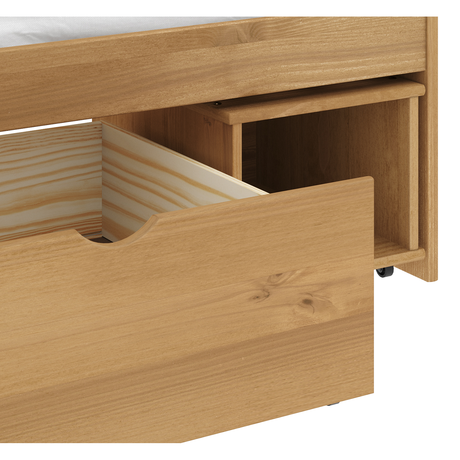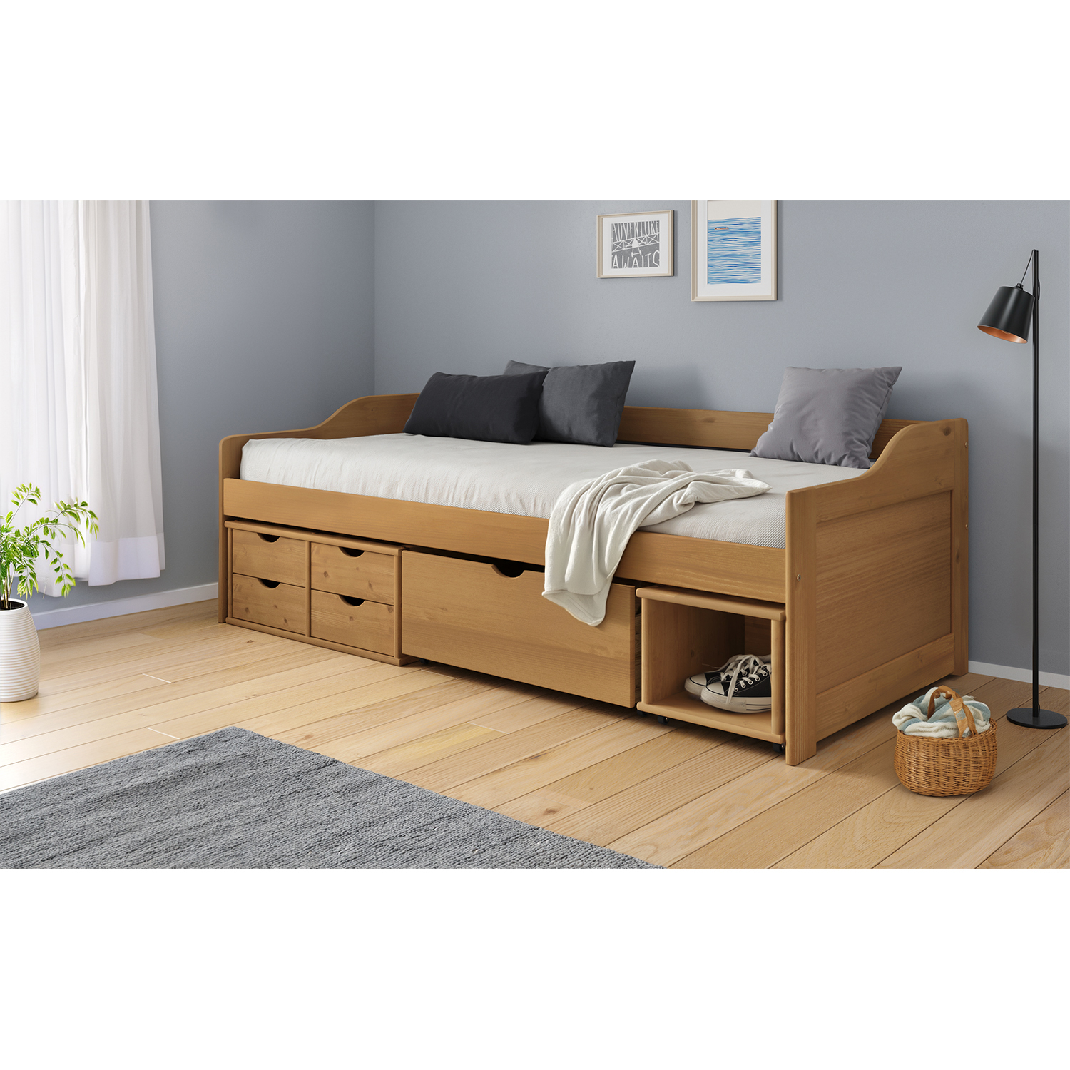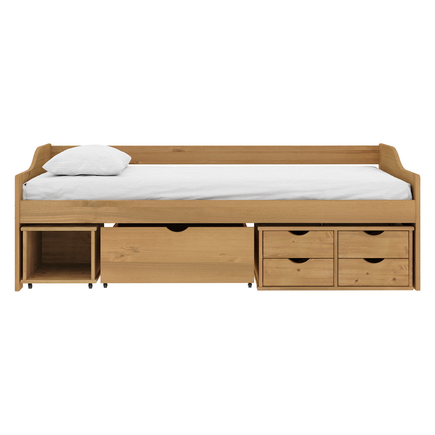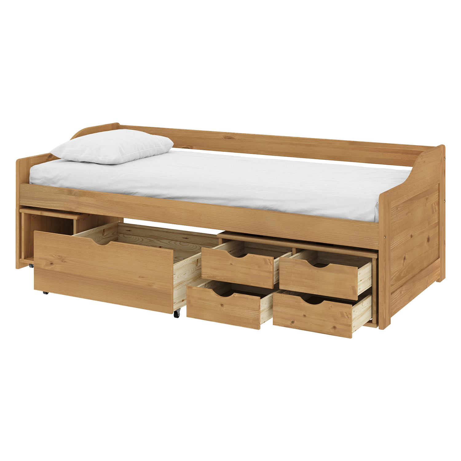 Das Einzelbett 8809V mit Schubladen ist das richtige Möbelstück, das mit Ihren Kindern mitwächst und viele Stauraumprobleme löst. Das hochwertige Einzelbett aus massivem, honigfarben gewachstem Kiefernholz wird nicht nur wegen seines Komforts bei Jung und Alt Anklang finden. In der breiten Schublade sowie in der Nische und den vier kleinen Schubladen findet alles Platz, was man aufbewahren und gleichzeitig griffbereit haben möchte. In der breiten Schublade finden Bettwäsche oder größere Spielsachen Platz, in den kleineren Schubladen Kissen, diverser Krimskrams und kleinere Spielsachen und in den schöneren Schubladen zum Beispiel eine Aktentasche oder ein Schulranzen. Das Einzelbett 8809V mit Schubladen wird auch die Bewohner von Einzimmerwohnungen oder kleinen Wohnungen erfreuen, denn dieses phantasievolle Möbelstück lässt sich leicht in ein bequemes Sofa verwandeln, indem man einfach einen gepolsterten Zylinder oder eine größere Anzahl von Kissen hinzufügt.