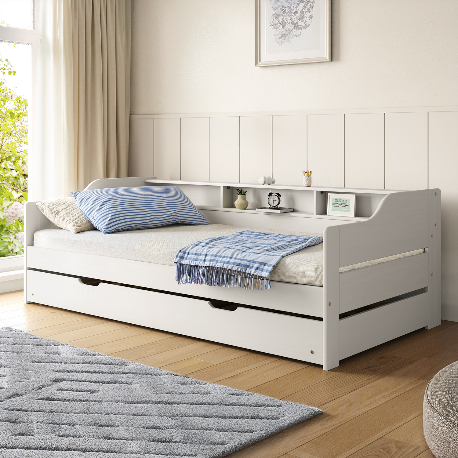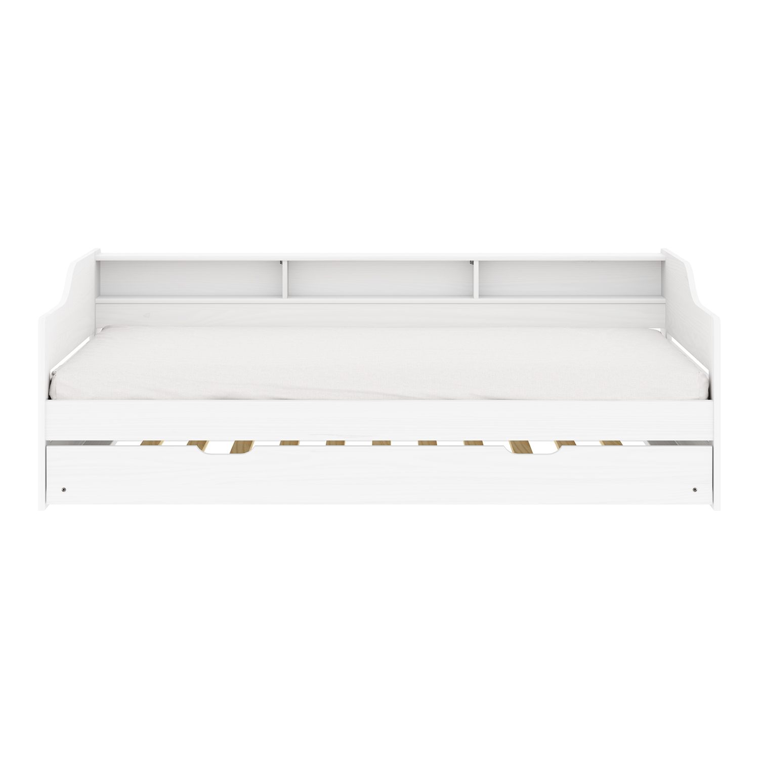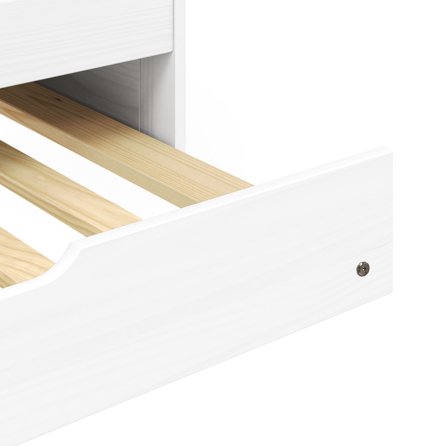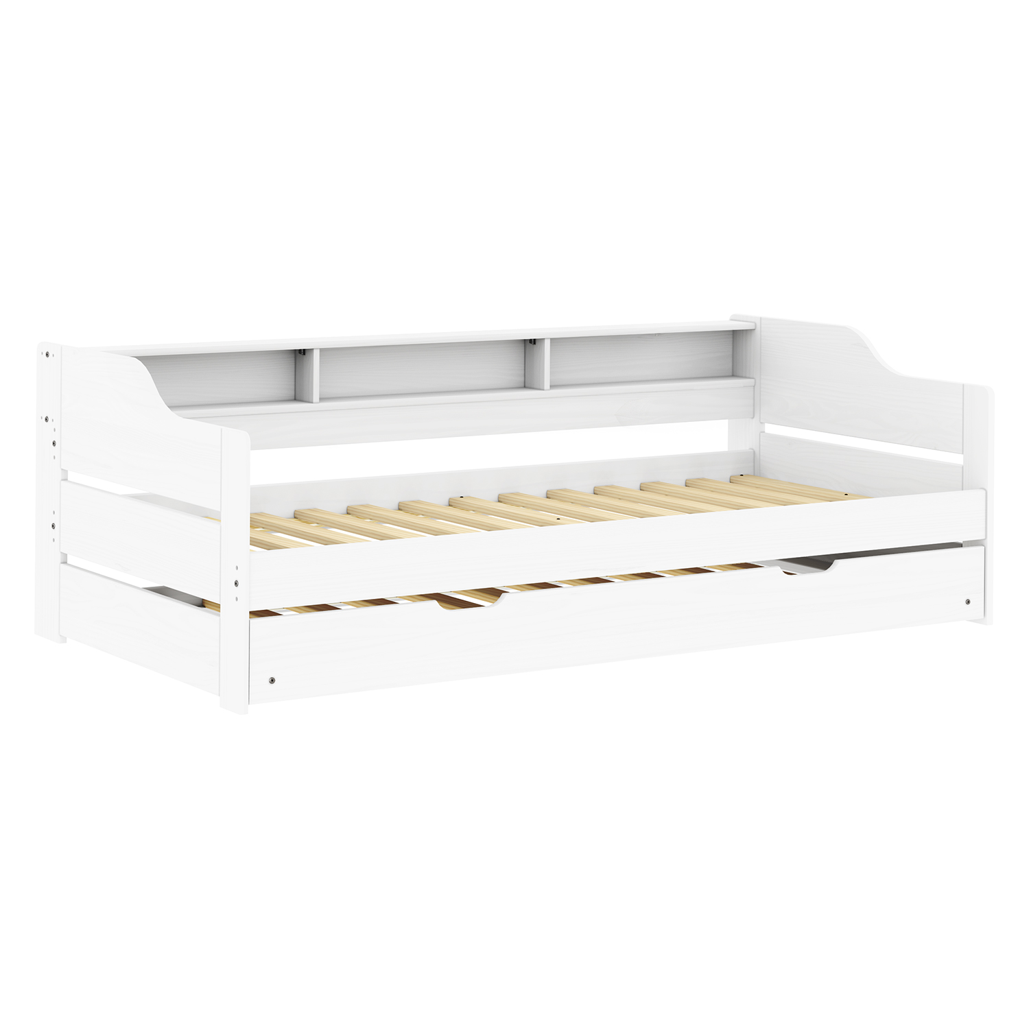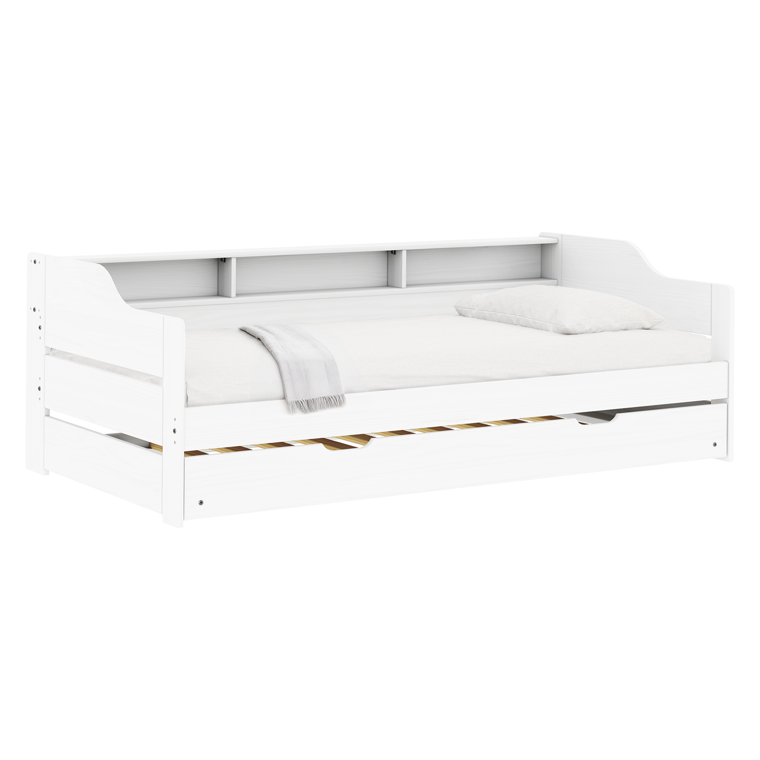 Das Einzelbett LILI in weißem Lack sieht frisch und elegant aus, ohne dabei an Funktionalität einzubüßen. Es ist aus massiver Kiefer gefertigt, was ihm eine hohe Festigkeit und Haltbarkeit verleiht. Die lackierte Oberfläche betont nicht nur die natürliche Maserung des Holzes, sondern schützt das Material auch vor Beschädigungen und erleichtert die Pflege. Das Design umfasst ein praktisches Ausziehteil, das als Zusatzbett dient. So lässt sich das Bett ohne aufwändige Vorbereitungen in ein Zusatzbett für Gäste oder Familienbesucher verwandeln. Der Auszug ist so konzipiert, dass er sich mühelos bedienen lässt und das Bett bei Nichtgebrauch fest an seinem Platz hält. Das Bett wird mit hochwertigen Lattenrosten geliefert, die eine stabile Matratzenauflage bieten und zu einem angenehmen Schlaf beitragen. Die Matratzen sind nicht im Lieferumfang enthalten, so dass Sie genau die Matratze auswählen können, die Ihren Bedürfnissen entspricht. Das schlichte Design des Bettes lässt sich leicht in eine Vielzahl von Interieurs integrieren, sei es in einem modernen, skandinavischen oder klassischen Stil. Die weiße Farbe erhellt den Raum optisch und verleiht ihm ein Gefühl von Sauberkeit und Ruhe. In Kombination mit dem natürlichen Aussehen des Holzes schafft es eine angenehme Atmosphäre zum Entspannen. Das Einzelbett LILI in Lack-weiß ist eine gute Wahl für alle, die eine Kombination aus Ästhetik, Zweckmäßigkeit und Haltbarkeit in einem Möbelstück suchen.