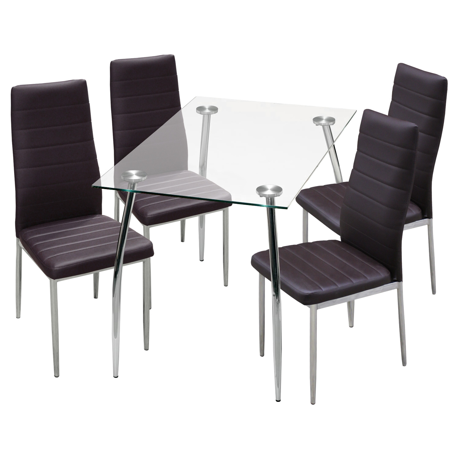 Das ist das Esszimmer, das mit dem Esstisch-Set GRANADA 4402 ausgestattet ist. Der große Tisch in einer Kombination aus Metall und einer Platte aus klarem, gehärtetem Glas vergrößert den Raum optisch. Das elegante Aussehen des Tisches wird durch die Stühle mit Kunstlederbezügen wunderbar ergänzt. Die Stuhlbeine sind wie die des Tisches aus verchromtem Metall, so dass sie gut miteinander harmonieren. Die dunklen Stuhlbezüge sind über die gesamte Länge genäht und unterstreichen die schlichte Form der Stühle. Dunkle Stühle und ein Glastisch sind eine sichere Wahl, wenn es darum geht, Ihre Küche repräsentativ zu gestalten. Wenn Sie nicht wollen, dass der Tisch zu minimalistisch aussieht, können Sie eine Blumenvase oder ein interessantes Gedeck auf die Oberfläche stellen und ihm so einen ganz anderen Look verleihen. Aber es geht doch nichts über eine schöne, saubere Fläche ohne Dekoration, nur mit leckerem Essen dekoriert. Machen Sie es sich mit der ganzen Familie oder Freunden auf bequemen Stühlen bequem und schlemmen Sie am gedeckten Tisch bis in die Nacht hinein.
