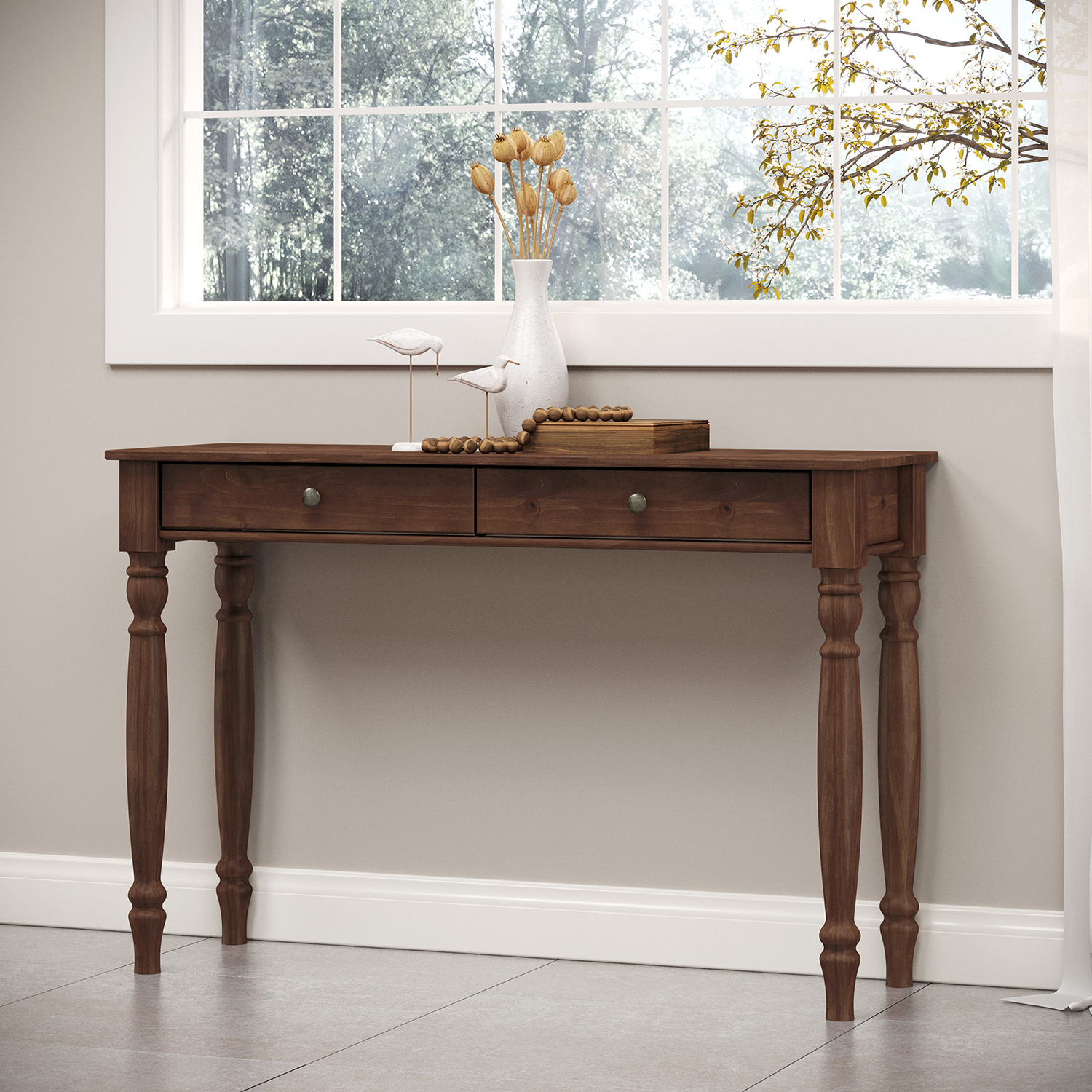 Der dunkelbraun lackierte Ablagetisch RUBI ist ein ehrliches Stück aus massivem Kiefernholz und bietet zwei Schubladen mit glatten Metallschienen. Der Tisch wirkt stabil und leicht dank seines schlichten Designs. Die dunkle Lackierung vermittelt ein Gefühl von natürlicher Tiefe und Wärme und ist dabei auch im täglichen Gebrauch leicht zu pflegen.