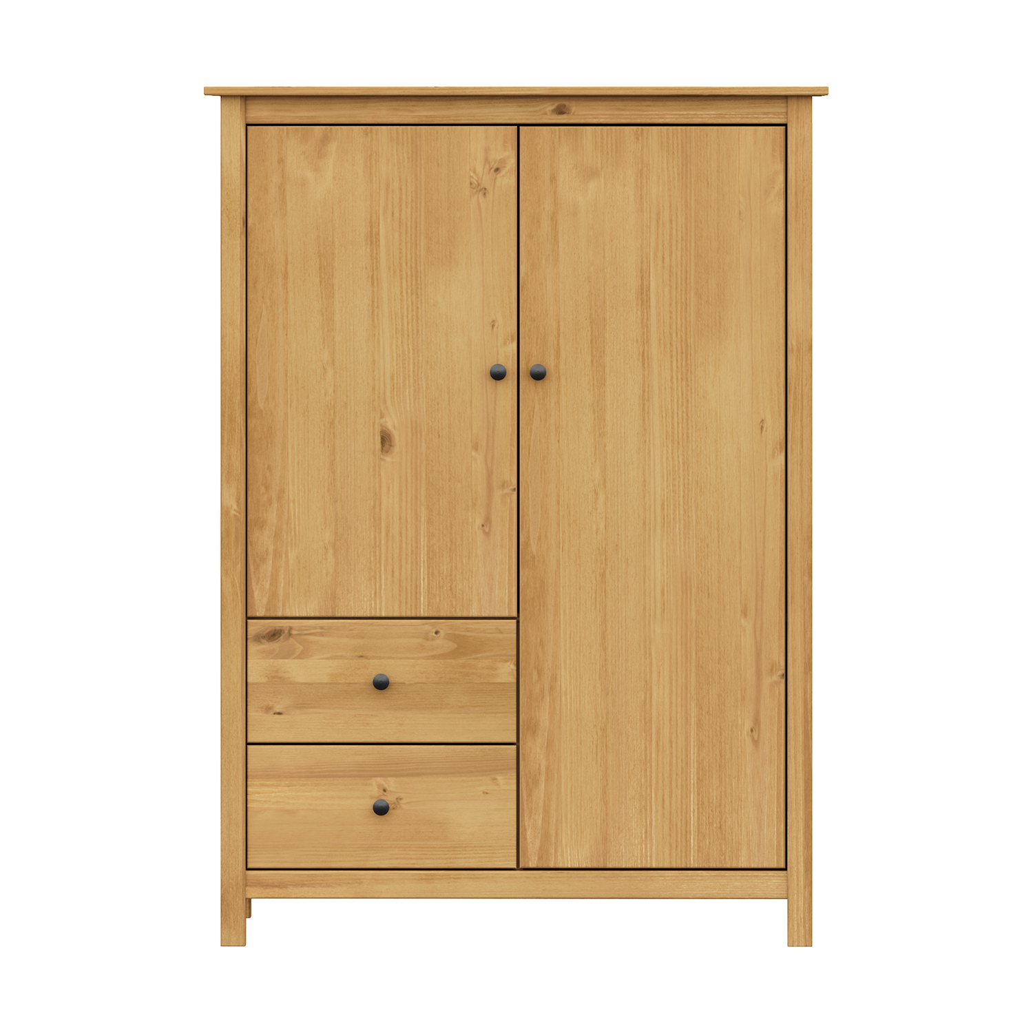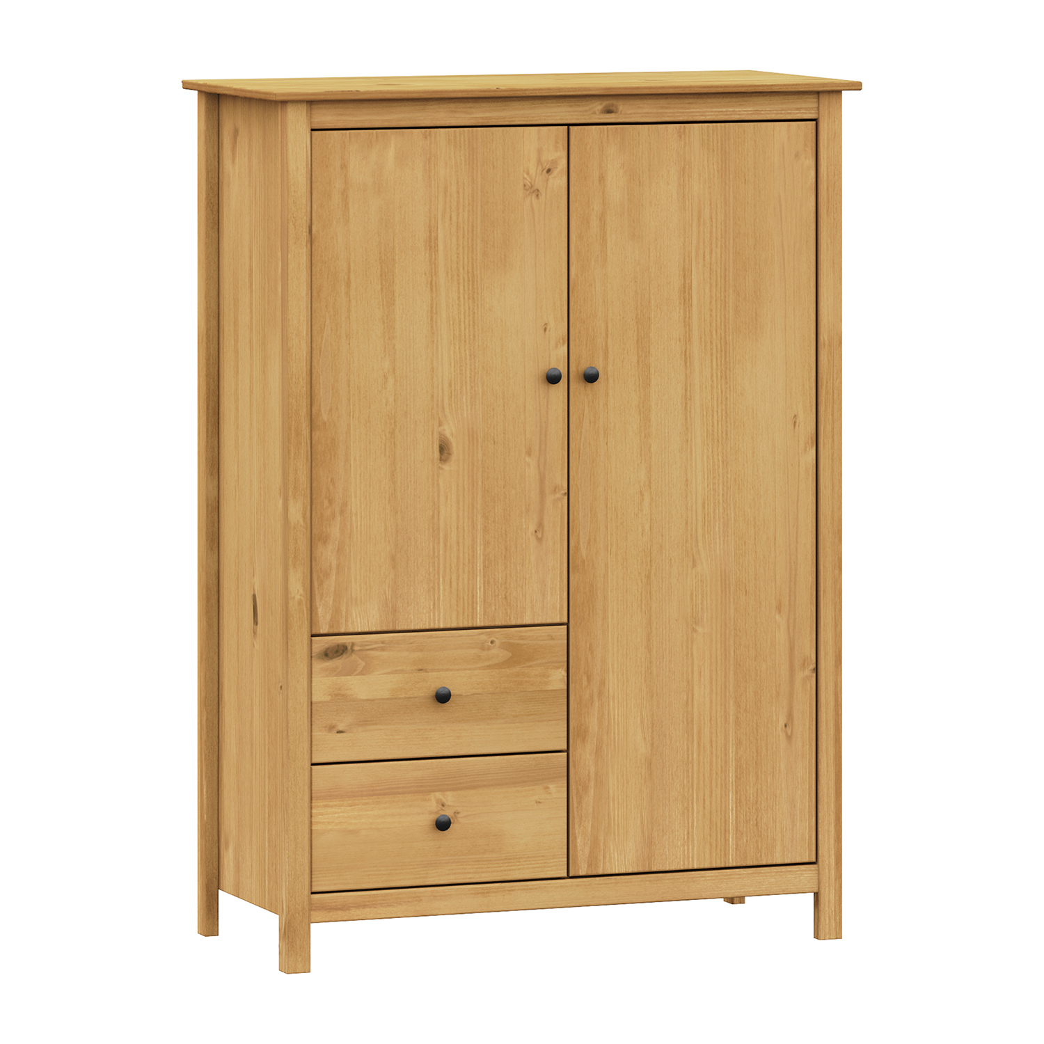 Produktcode: 4487Material massives Kiefernholz gewachst in HonigtonMetallgriffe aus geschwärztem MessingKleiderschrank mit Garderobenstange und RegalSchublade am Boden mit MetallschienenEmpfohlener Auszug 8188V