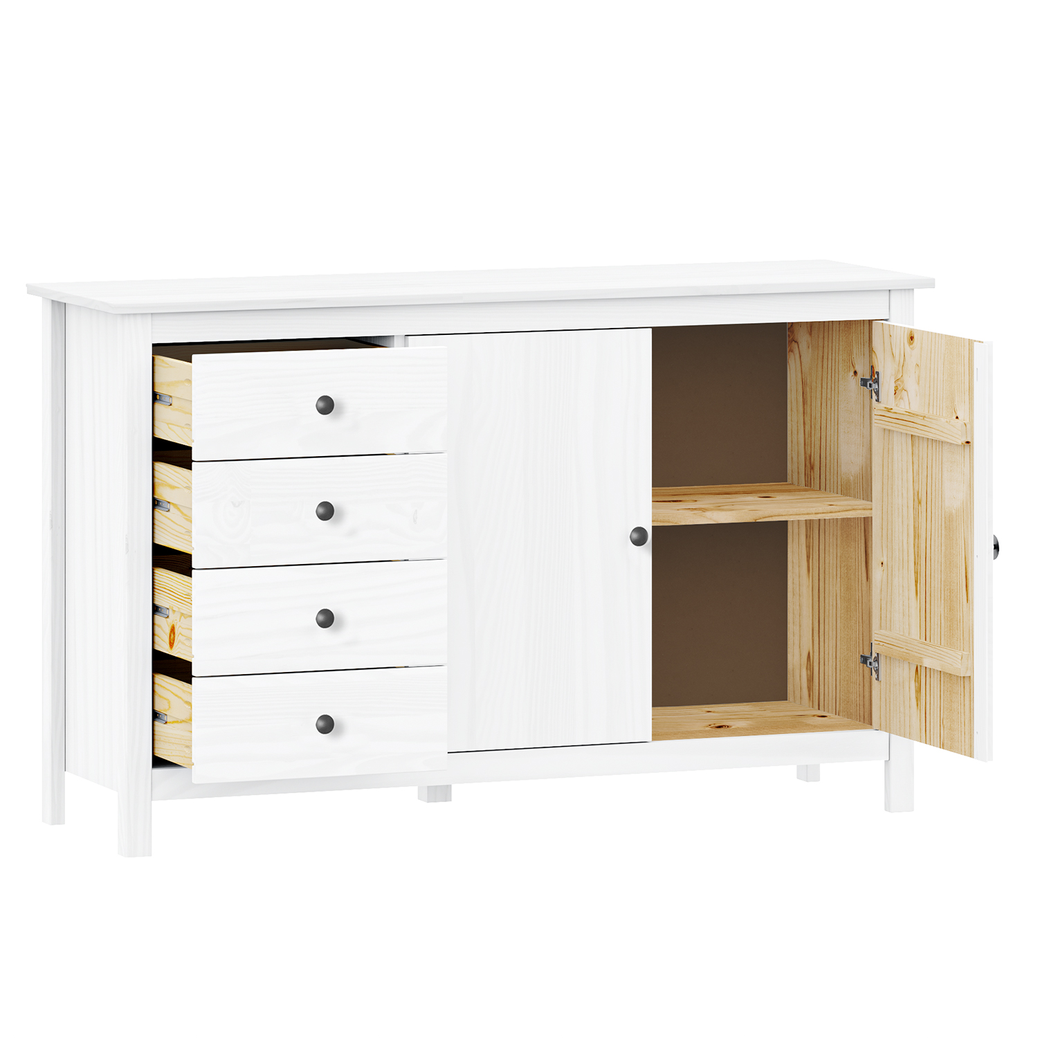 4 Schubladen mit Metallschienen, 2 massive Türen, 1 Einlegeboden