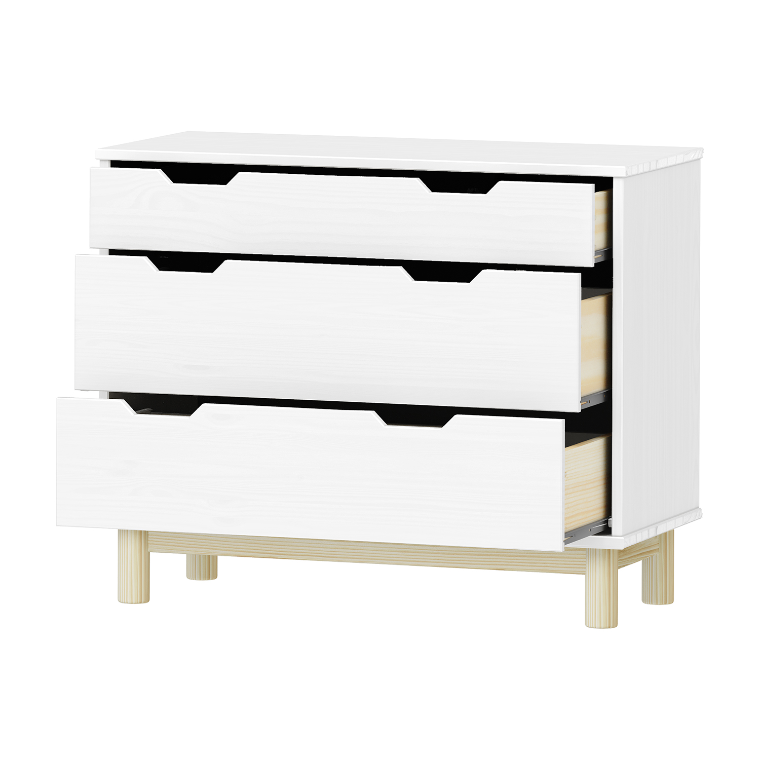 Produktcode: 324261VMaterial massives Kiefernholz, lackierte Oberfläche1 kleinere und 2 größere Schubladen mit Metallschienen