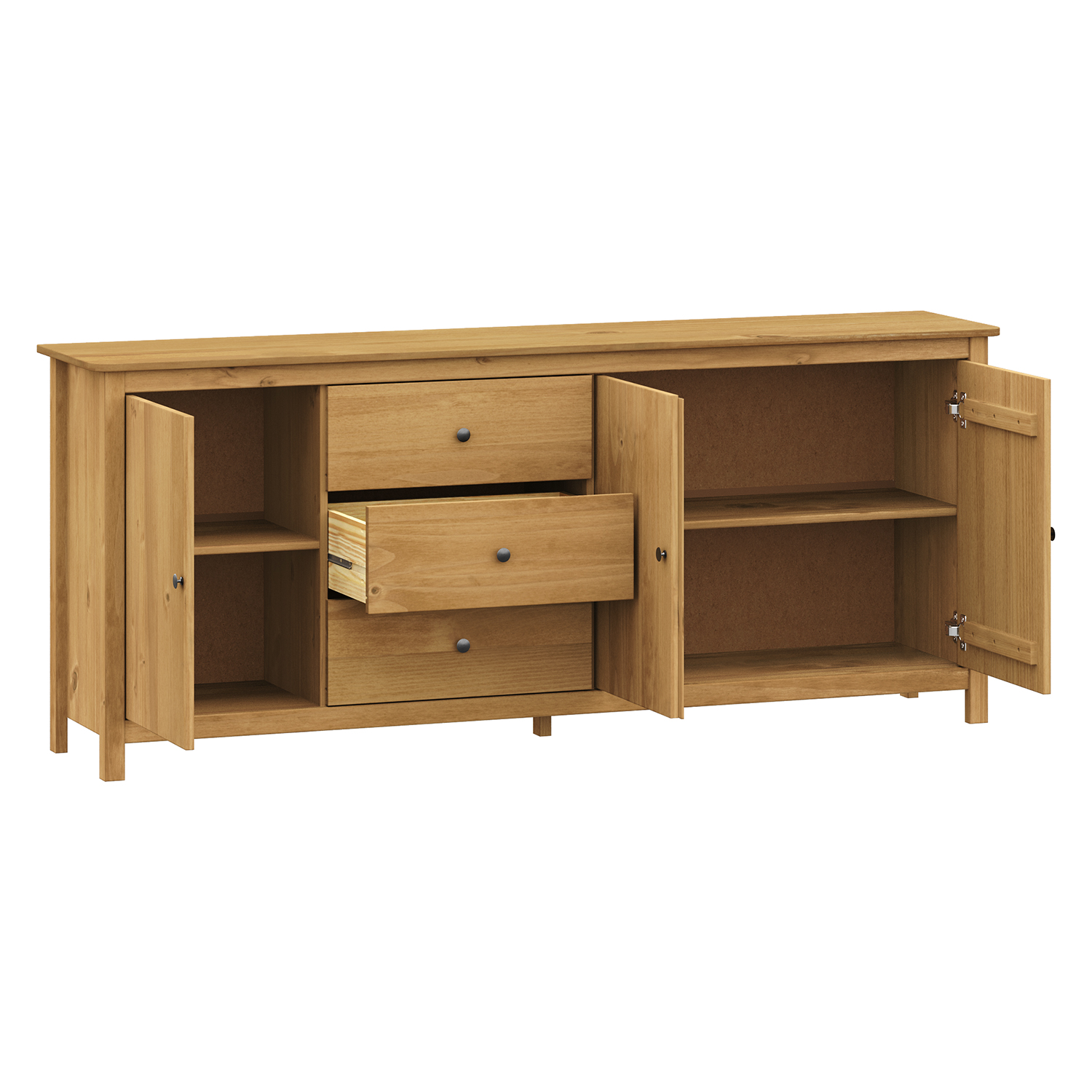 Produktcode: 8093VMaterial massives Kiefernholz gewachst in HonigtonMetallgriffe aus geschwärztem Messing3 Türen, 3 Schubladen mit Metallschienen passendes Zubehör TORINO 8063V Erweiterung