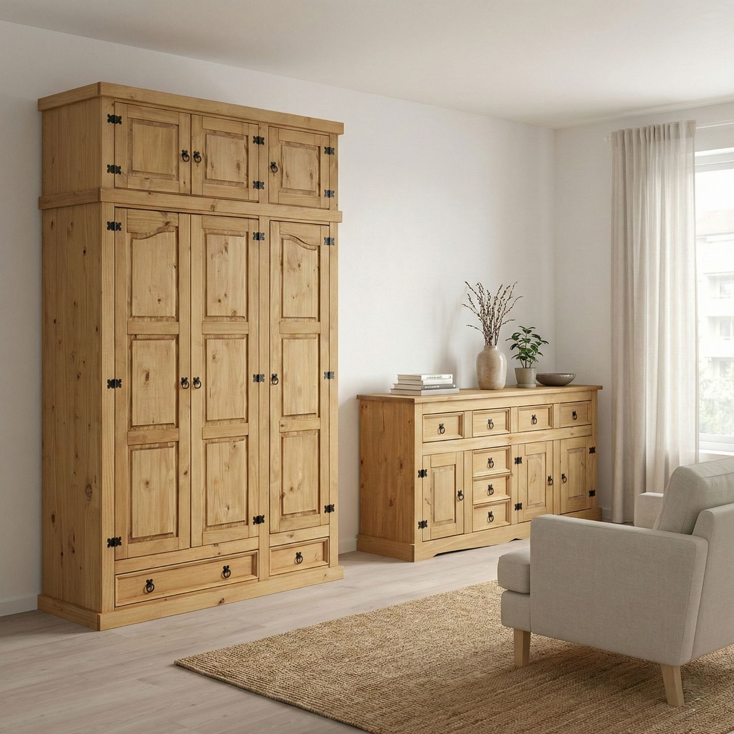 Produktcode: 162634Material massives Kiefernholz gewachst in Honig-Ton 2 Türen, 5 Schubladen, dekorative Metallgriffe kann mit der Erweiterung Corona 16465 ergänzt werden Teil des Corona-Sets