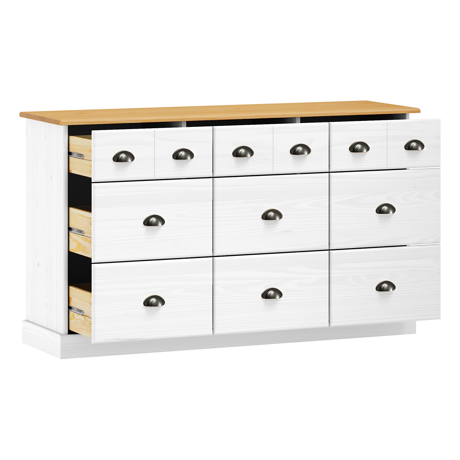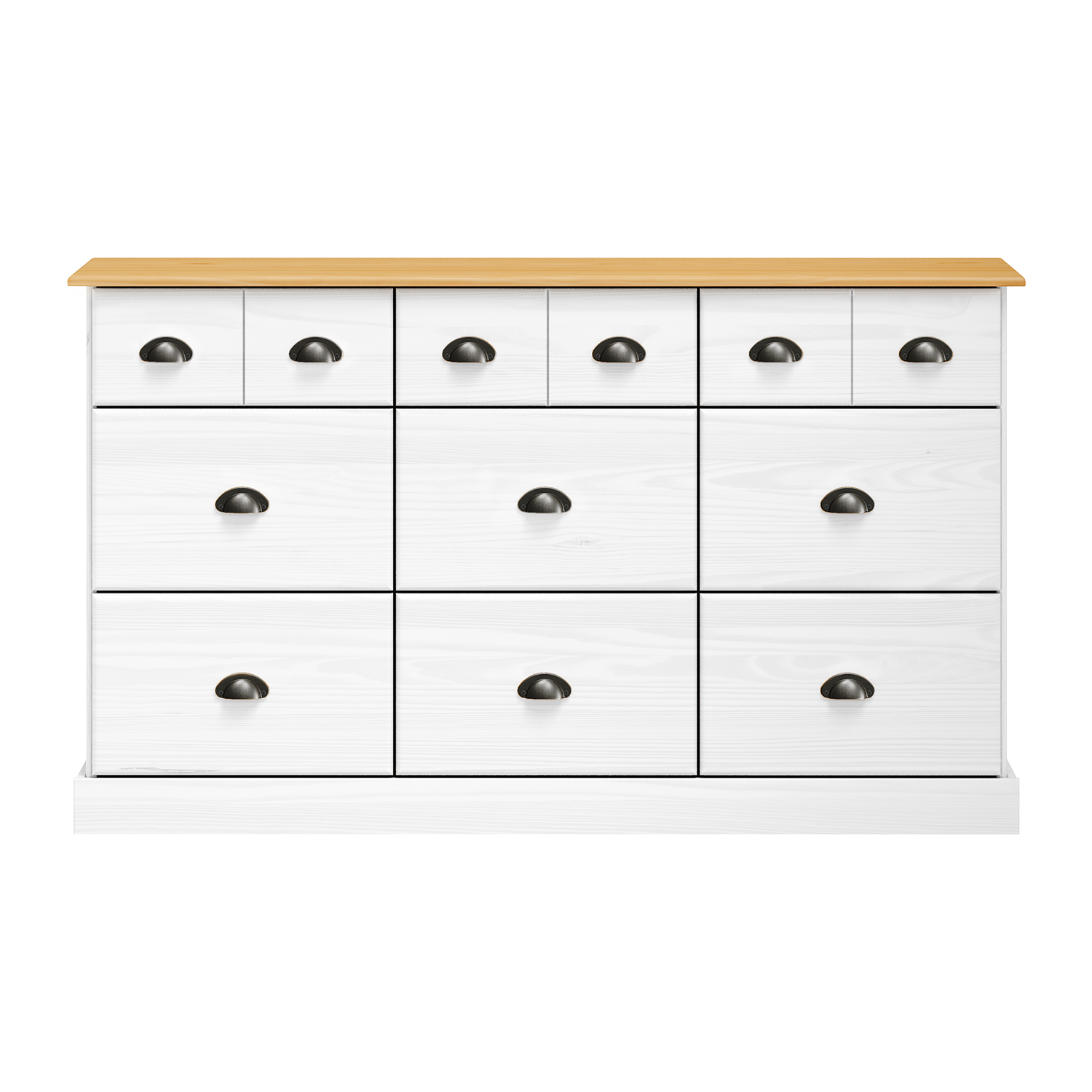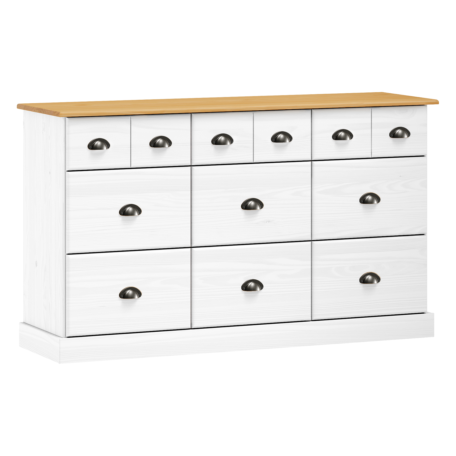 Die Kommode STANFORD mit neun Schubladen in Lack-weiß ist die ideale Kombination aus Funktionalität, zeitlosem Stil und reinem Design. Ihre Proportionen und ihre Farbgebung sind elegant und luftig, wodurch sie sowohl zu modernen als auch zu klassischen Retro-Einrichtungen perfekt passt. Die weiße Lackierung unterstreicht den frischen Look und macht es außerdem leicht, es mit anderen Möbeln zu kombinieren. Das massive Kiefernholz verleiht der gesamten Struktur Stärke und Haltbarkeit. Die Lackierung sorgt für Widerstandsfähigkeit gegen normale Abnutzung, wobei die natürliche Struktur des Holzes unter einer feinen Lackschicht erhalten bleibt. Die Kommode verfügt über sechs größere und drei kleinere Schubladen und ist damit ein äußerst praktischer Stauraum für Kleidung, Dokumente und andere Dinge des täglichen Bedarfs. Die Metallgriffe verleihen der Kommode ein dezentes industrielles Detail und sorgen gleichzeitig für ein bequemes Öffnen der Schubladen. Außerdem sind sie mit hochwertigen Metallschienen ausgestattet, die für einen reibungslosen Betrieb sorgen. Die Kommode STANFORD eignet sich für das Schlafzimmer, die Diele, das Arbeitszimmer und das Kinderzimmer. Sie ist ein zuverlässiges Möbelstück, das nicht nur nützlich ist, sondern auch jeden Raum gemütlich und organisiert macht.