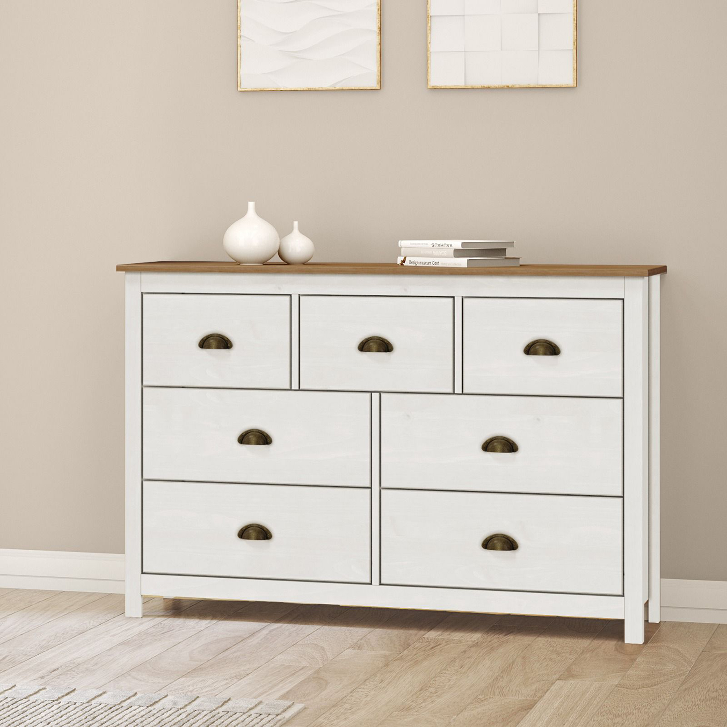 Produktcode: 206261Material massives Kiefernholz, Farbe weiß / braun lackiert acht Schubladen mit Metallgriffen und -schienenAbmessungen der Schubladen (B/H/H) 49,5 × 33,5 × 9 cm