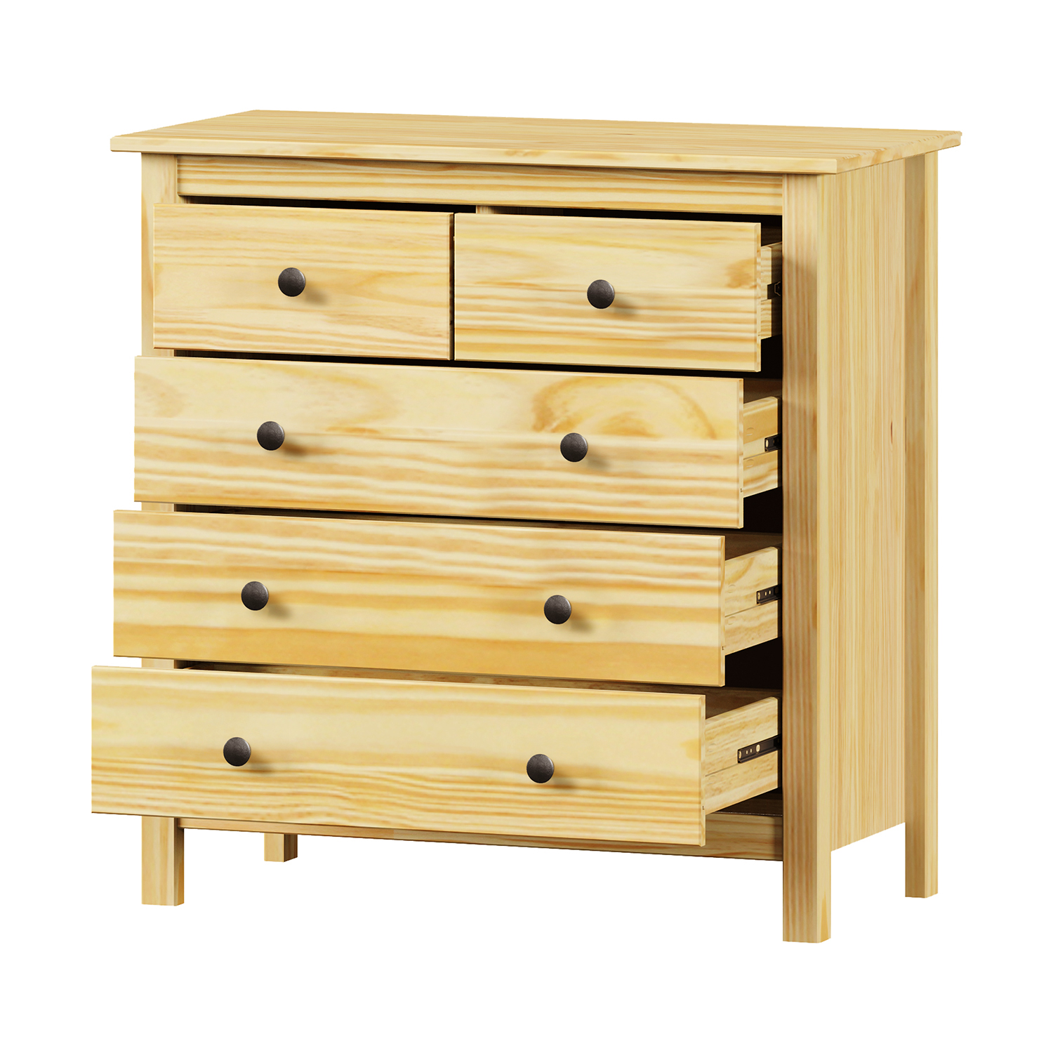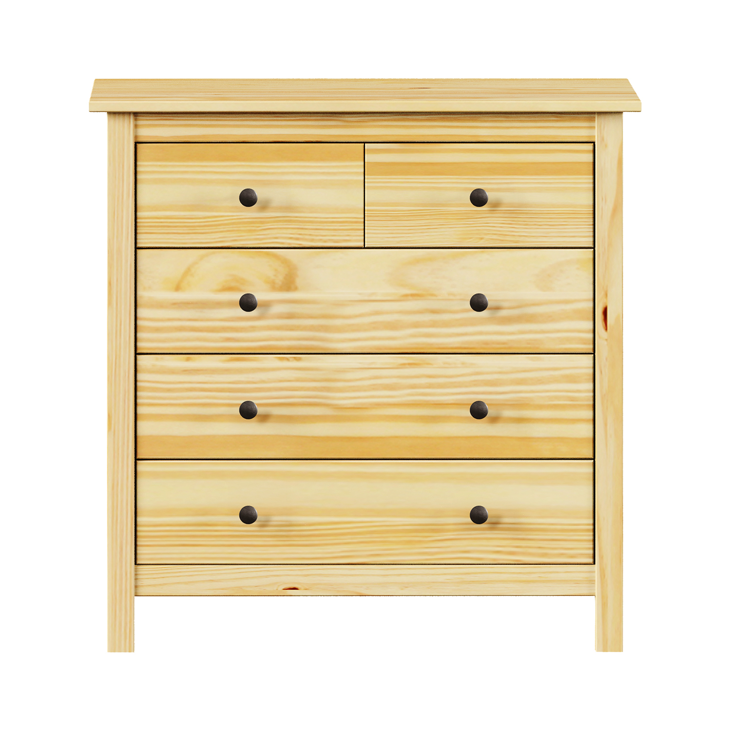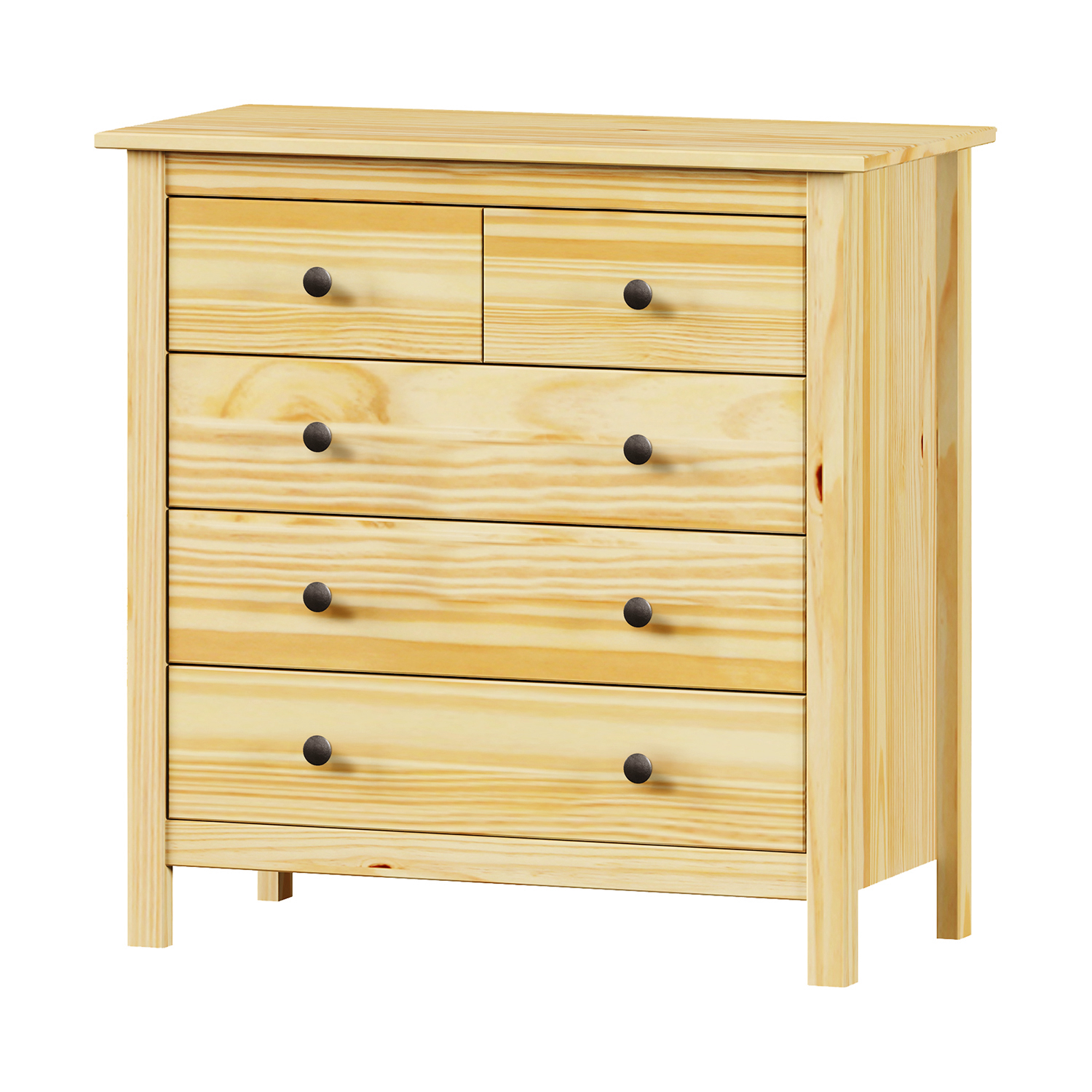 Die Kommode TORINO aus massivem Kiefernholz ist eine praktische und zeitlose Ergänzung für jede Einrichtung. Dank ihrer lackierten Oberfläche behält sie das natürliche Aussehen des Holzes und ist gleichzeitig vor den täglichen Abnutzungserscheinungen geschützt. Seine schlichten Linien und sein natürlicher Farbton verleihen ihm einen vielseitigen Charakter, der sich sowohl in moderne als auch in klassische Räume einfügen lässt. Die fünf Schubladen bieten reichlich Stauraum für Kleidung, Dokumente und kleine Gegenstände, die Sie immer griffbereit haben möchten. Die Schubladen sind mit Metallschienen ausgestattet, die einen reibungslosen und leisen Betrieb gewährleisten. Die Metallgriffe verleihen der Kommode einen subtilen industriellen Touch und sind gleichzeitig praktisch für den täglichen Gebrauch. Die Kommode eignet sich für das Schlafzimmer, das Wohnzimmer und die Diele. Die solide Massivholzkonstruktion macht sie stabil und langlebig. Die Ablagefläche ist ideal, um Dekorationen, eine Lampe oder einen Spiegel zu platzieren. Dieses Möbelstück bietet nicht nur Funktion, sondern auch Stil, der jahrelang hält. Die Kommode TORINO ist die richtige Wahl für alle, die ehrliches Holz, klares Design und eine praktische Lösung ohne unnötigen Schnickschnack bevorzugen. Sie sieht gut aus, funktioniert einwandfrei und hat eine lange Lebensdauer.