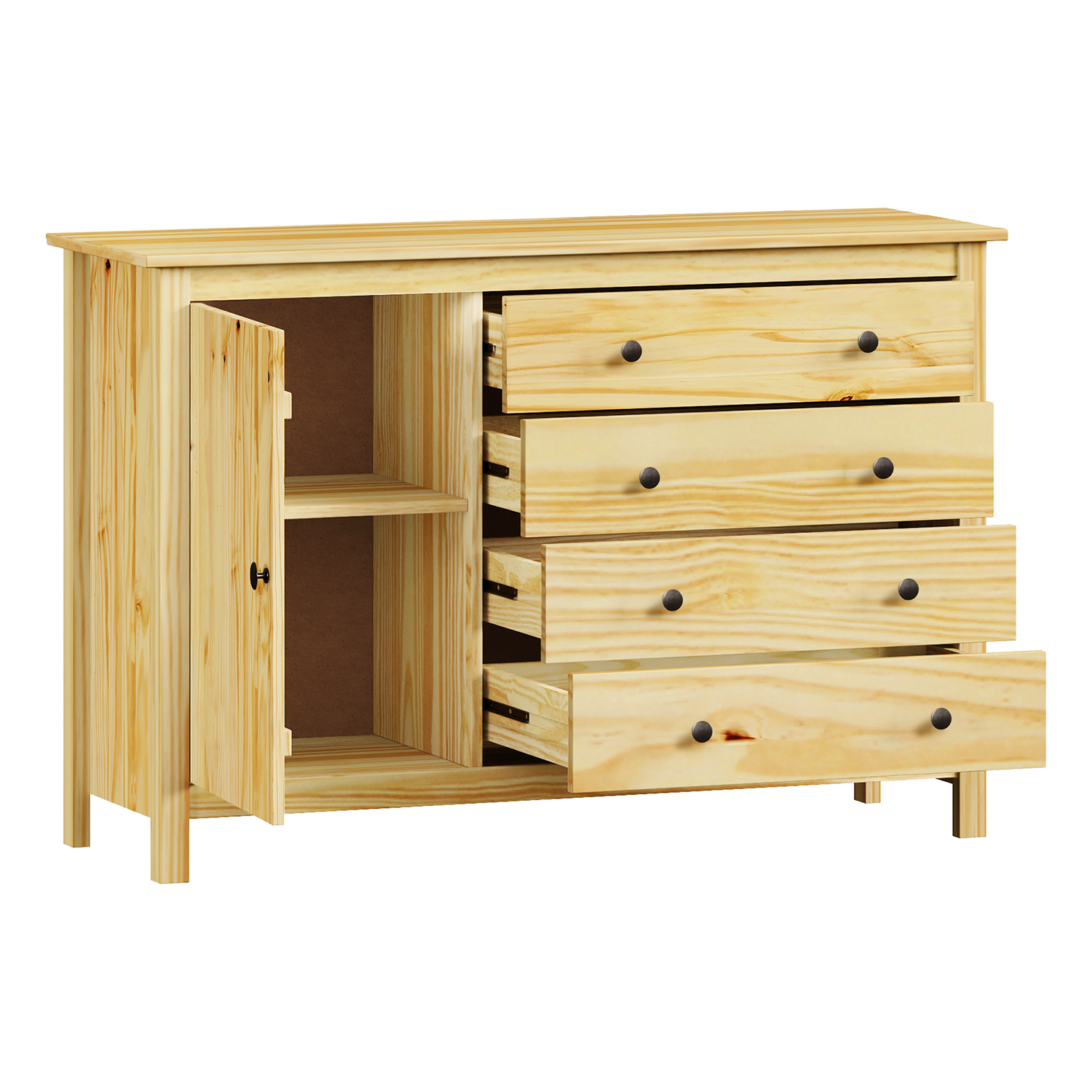 Komoda TORINO v lakovaném provedení z masivu borovice je poctivý a funkční kousek nábytku, který nenásilně dotváří interiér. Je pevná a stabilní a přitom nepůsobí robustně. Lakovaný povrch chrání dřevo a zároveň zdůrazňuje jemnou kresbu. Každý detail je promyšlený, ale nenápadný. Komoda nabízí čtyři zásuvky, které poskytují dostatek úložného prostoru pro oblečení, dokumenty nebo drobnosti, které chcete mít přehledně uspořádané. Zásuvky jsou vedeny na kovových pojezdech a otevírají se plynule a tiše. Kovové úchytky jsou pohodlné na úchop a ladí s celkovým minimalistickým designem, aniž by působily dekorativně. Vedle zásuvek jsou dvířka, za nimiž se skrývá police. Tato kombinace nabízí flexibilitu, místo pro objemné věci i prostor, který uspořádáte přehledně bez plastových boxů. Vnitřní police i zásuvky uloží vaše poklady, jakmile dveře zavřete. Komodu snadno využijete v ložnici i v obývacím pokoji, ani v předsíni neruší její přirozený vzhled. Horní deska je dostatečně pevná pro dekorace, lampu nebo květiny. Je to kousek nábytku, který zůstane věrný roky. Komoda TORINO je pro ty, kdo hledají spolehlivé řešení bez kompromisů. Je praktická, kvalitní a působí přirozeně. Je to poctivý základ, který vytvoří prostor pro váš život, aniž by ho přehlušil.