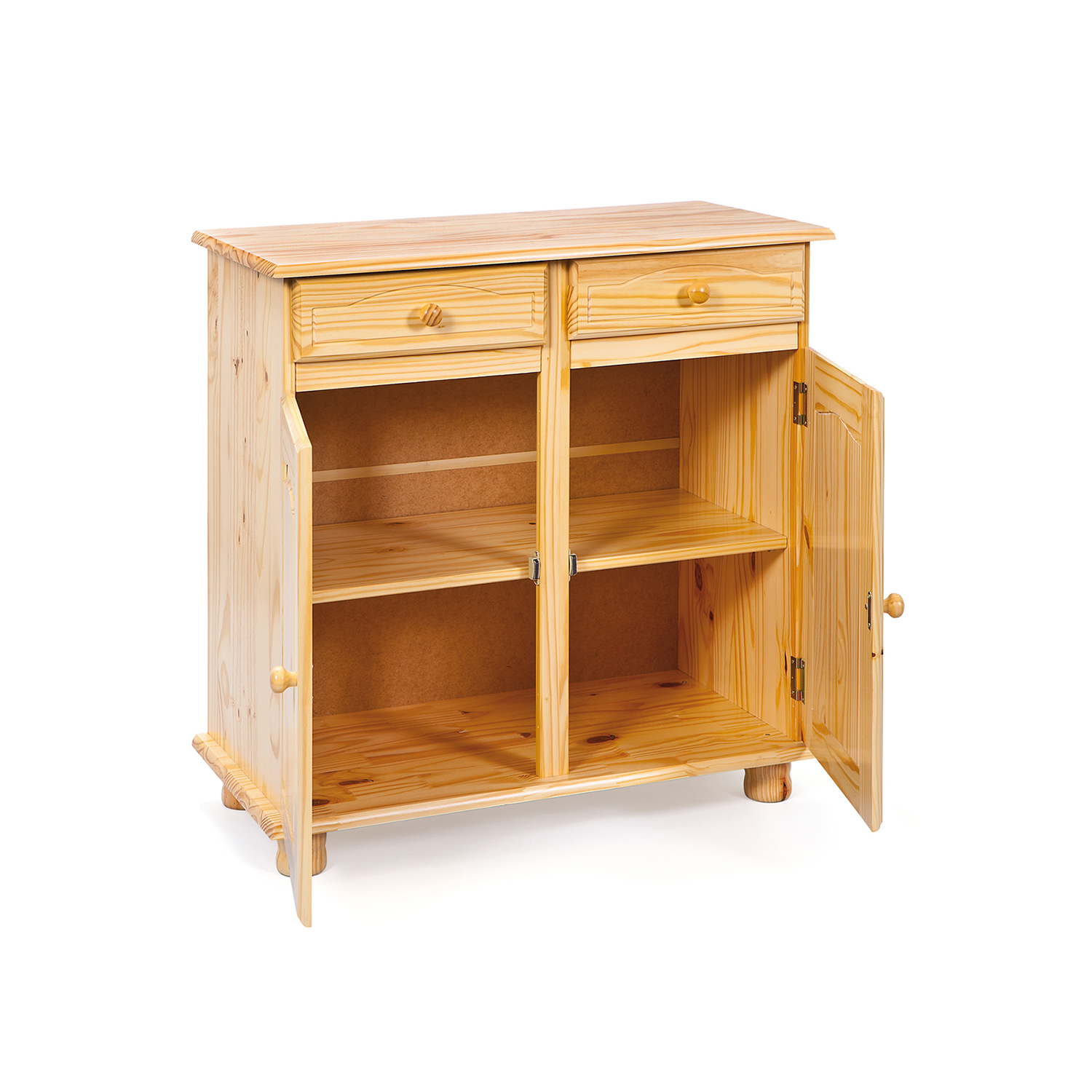Die Entscheidung liegt ganz bei Ihnen, denn dieses massive Möbelstück lässt sich in verschiedenen Räumen aufstellen und kann sowohl als Kommode als auch als Anrichte dienen, je nachdem, wo es aufgestellt wird und was Sie aufbewahren möchten. Die Kommode PAMINA aus massiver Kiefer sieht in jedem Raum gut aus. Verwenden Sie sie im Wohnzimmer zur Aufbewahrung von Gegenständen und Büchern aller Art, im Schlafzimmer als Kommode für Kleidung, im Kinderzimmer für Spielzeug und im Esszimmer für Besteck, Küchenutensilien, Töpfe und Pfannen. Die Kommode PAMINA enthält zwei Schubladen mit Metallschienen zur Aufbewahrung kleinerer Gegenstände, und der Raum hinter der Tür kann zur Ablage größerer Gegenstände, Kisten oder Kartons genutzt werden. Die massiven Möbel sind von hoher Qualität und die atemberaubende Holzmaserung frischt jeden Raum schön auf.