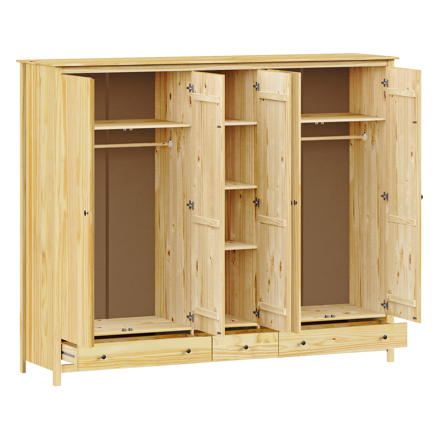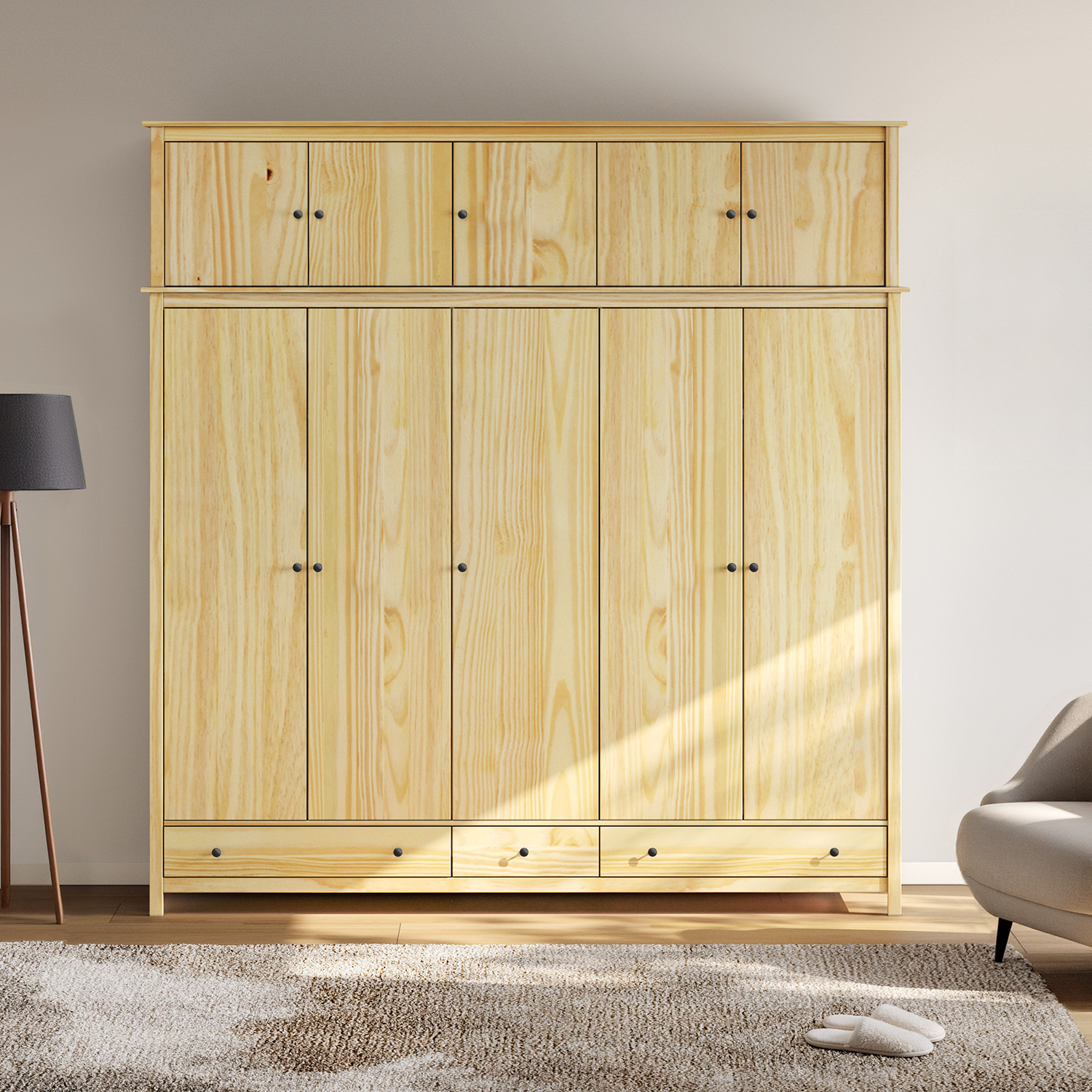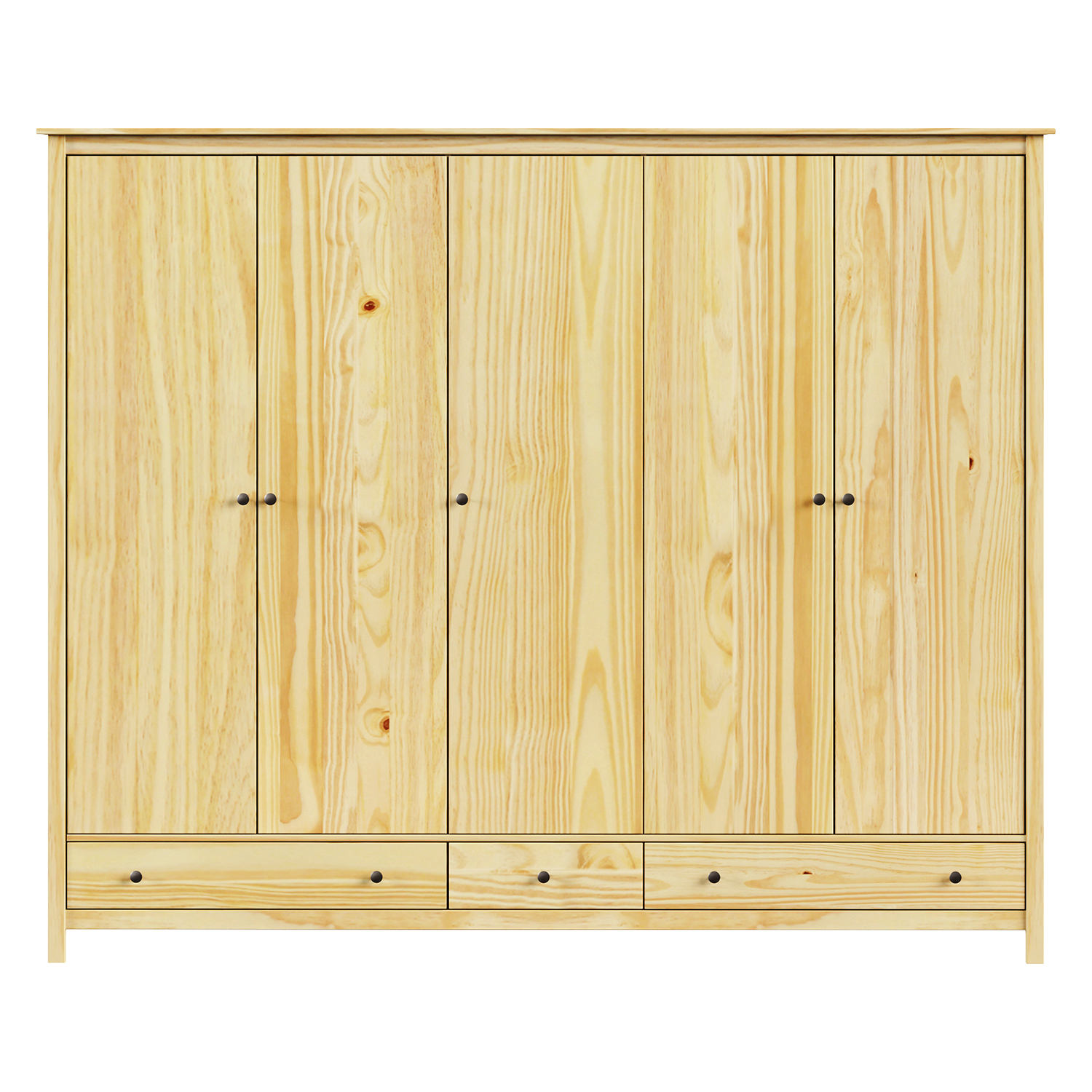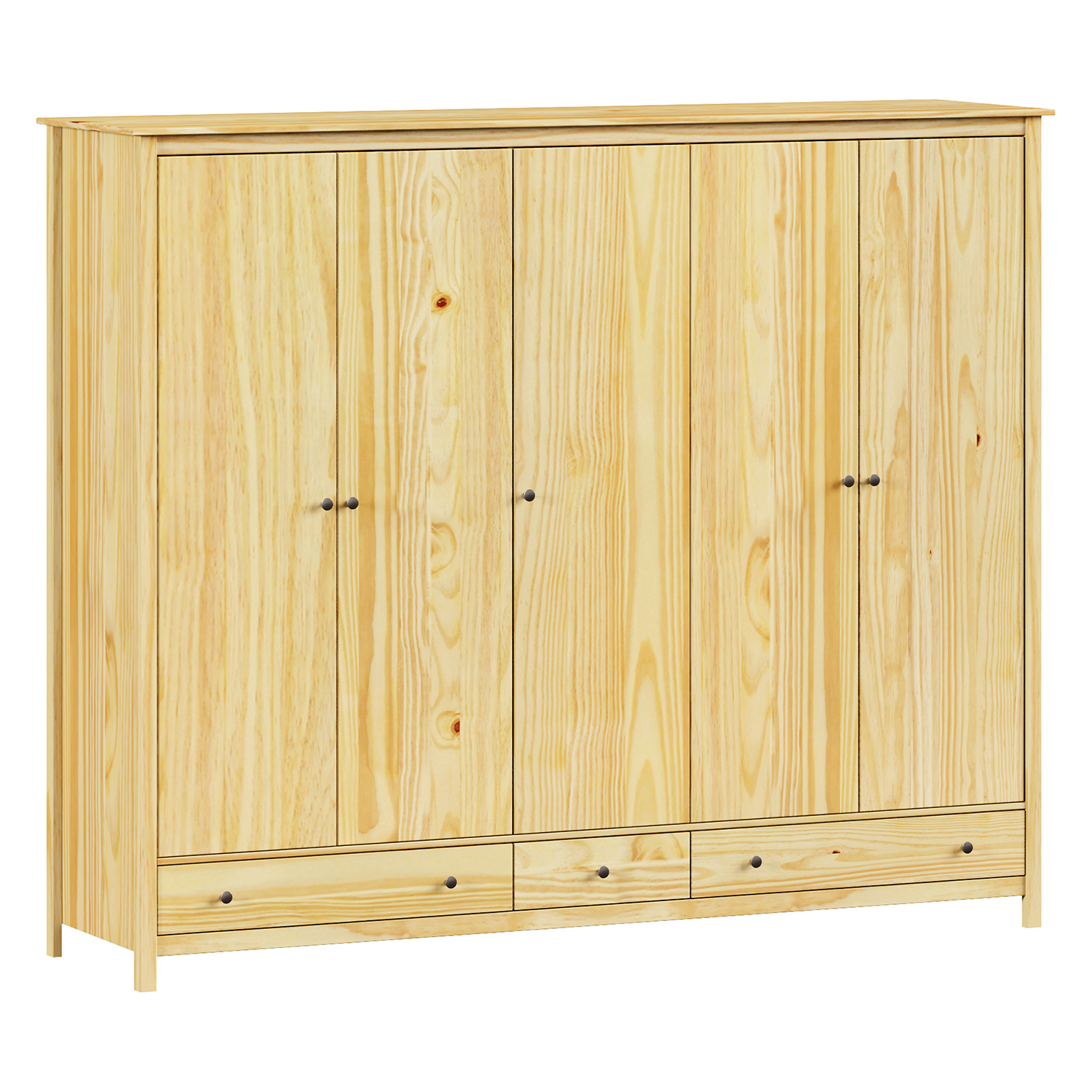 Der fünftürige Kleiderschrank TORINO bringt Ehrlichkeit, Schlichtheit und zeitloses Design in den Innenraum. Er ist aus massiver Kiefer gefertigt und seine Oberfläche ist lackiert, was dem Holz einen natürlichen Farbton verleiht und es gleichzeitig schützt. Die natürliche Maserung des Holzes ist schön sichtbar und vermittelt einen ruhigen Eindruck. Der Kleiderschrank bietet viel Stauraum, der in allen Arten von Schlafzimmern genutzt werden kann, aber auch perfekt in einen geräumigen Flur oder ein Ankleidezimmer passt.