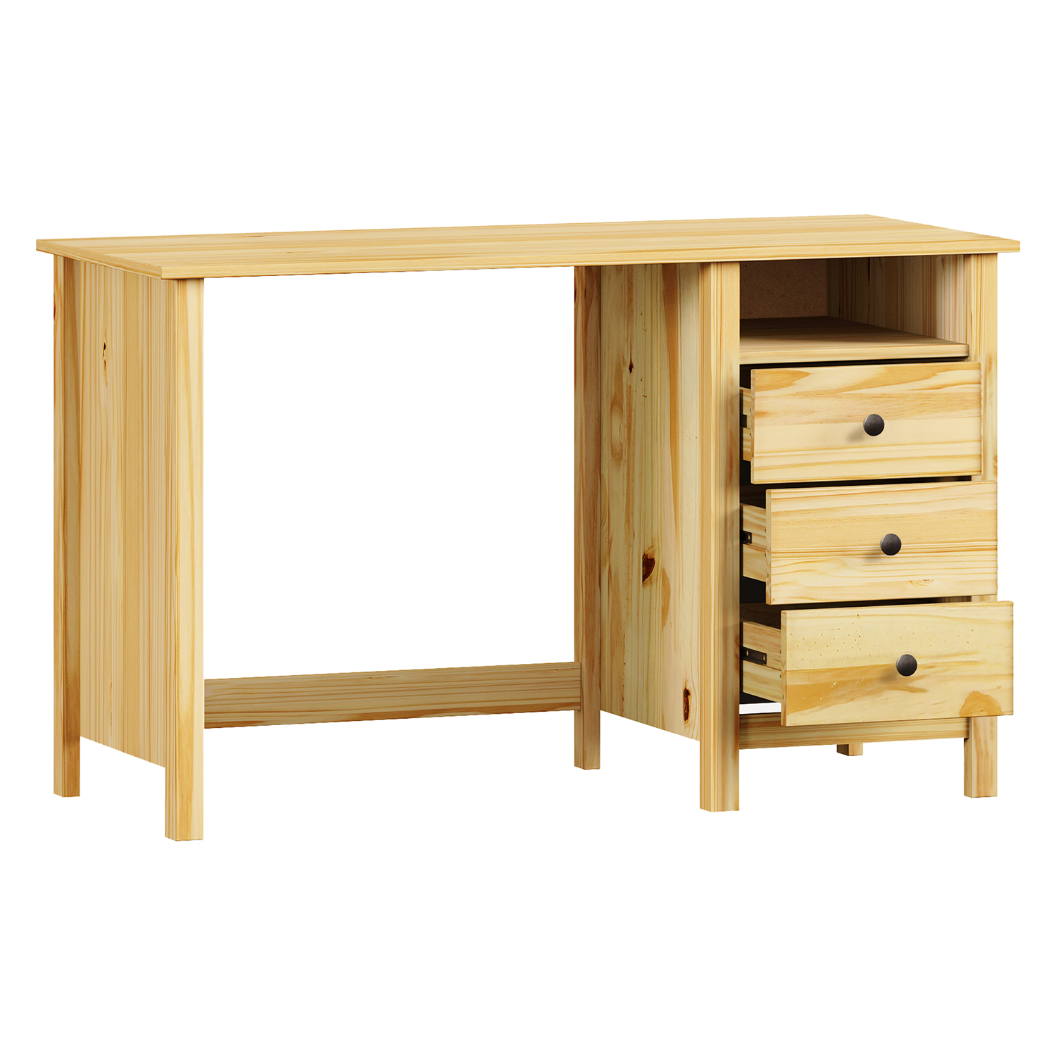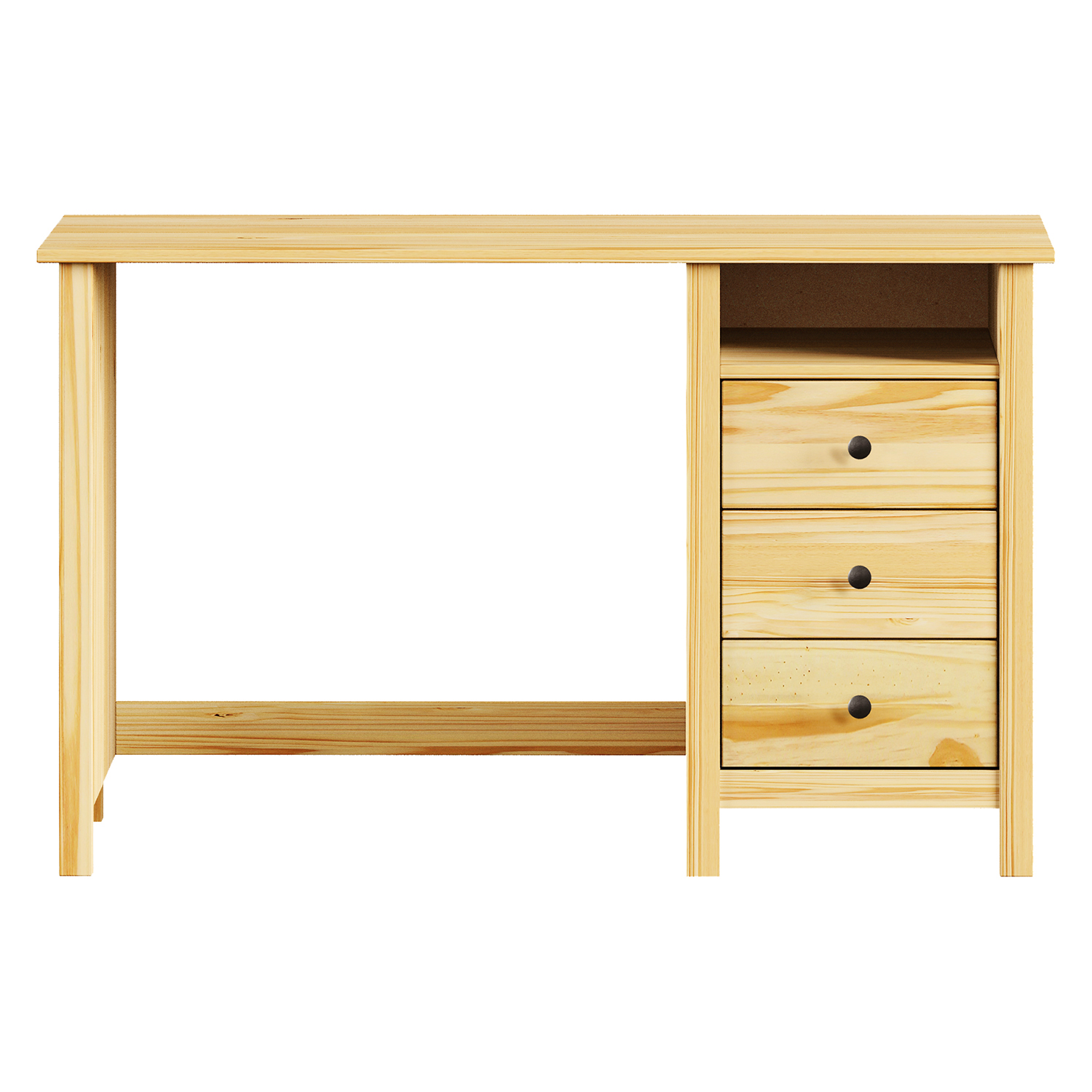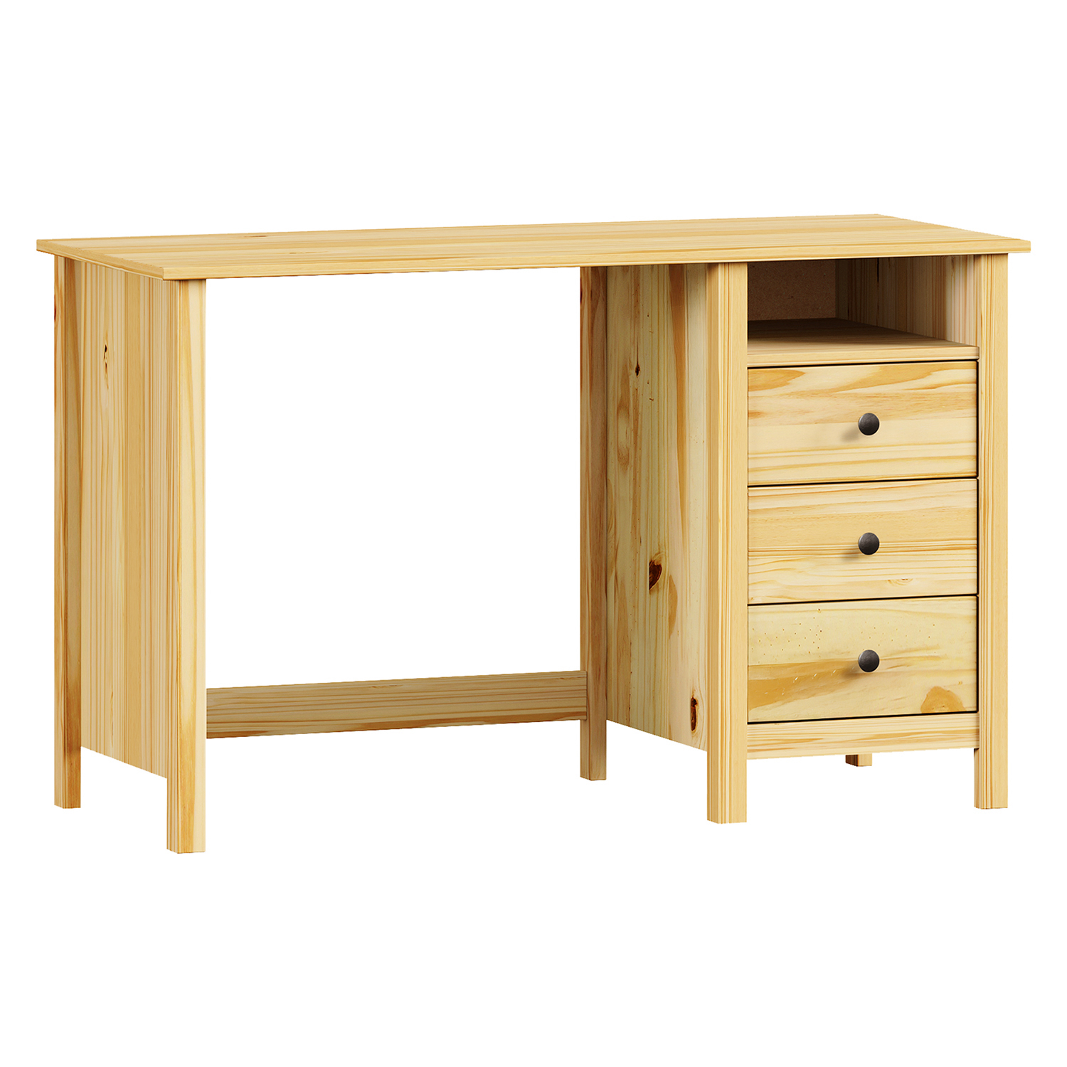 Der Massivholz-Schreibtisch TORINO ist ein Möbelstück, das mit nichts spielt. Er braucht keine Dekoration, um zu beeindrucken. Seine Stärke liegt in seinem Material, seiner einfachen Konstruktion und seinem natürlichen Aussehen. Massives Kiefernholz mit einer lackierten Oberfläche sieht authentisch aus und bringt Ruhe in den Raum. Das Holz atmet und duftet. Es unterscheidet sich optisch und haptisch völlig von billigen Imitationen. Die Arbeitsfläche ist geräumig genug für normale Arbeit und Home Office. Die drei Schubladen sind mit Metallschienen und Metallgriffen ausgestattet, die nicht stören, sondern den Look vervollständigen. Sie bieten Stauraum für Dokumente, Schreibwaren und Kleinigkeiten, die sonst verstreut auf dem Schreibtisch landen. Die Konstruktion des Tisches ist solide und stabil. Beim Schreiben oder Arbeiten mit dem Laptop wackelt nichts, alles bleibt fest stehen. Der Tisch nimmt nicht zu viel Platz weg. Gleichzeitig dient er als vollwertiger Arbeitsbereich. Er ist sowohl für das Arbeitszimmer als auch für das Studentenzimmer geeignet. In der Einrichtung wirkt er gemütlich, ohne prätentiös zu sein. Egal, ob man ihn an die Wand stellt oder frei im Raum aufstellt, er fügt sich ein und macht Sinn. Jedes Detail ist durchdacht und zeigt, dass Zweck und Aussehen Hand in Hand gehen. TORINO ist kein moderner Trend. Es ist ein ehrliches Möbelstück, das dem täglichen Gebrauch gewachsen ist, ohne zu reden. Er hat Charakter, versucht aber nicht, die Aufmerksamkeit auf sich zu ziehen. Einfach ein Tisch, der Ihnen lange und gut dienen wird.