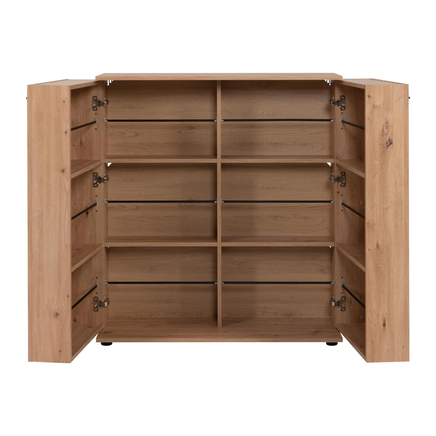 Möchten Sie, dass der Flur modern und sehr angenehm aussieht? Dann entscheiden Sie sich für ein glattes Schuhregal, das nur mit zwei schwarzen Metallgriffen ausgestattet ist und sich wunderbar in einen perfekt aufgeräumten Raum einfügt, Minimalismus ist immer noch in. Das Schuhregal SATOS 02A in Eiche Artisan ist ein unglaublich elegantes Möbelstück. Das Aussehen des Schuhregals verleiht dem Raum eine ruhige und frische Atmosphäre. Das Schuhregal enthält zwölf Fächer, in denen Sie Ihre Schuhe ordentlich stapeln können, bis zu 24 Paar verschiedene Schuhe und Hausschuhe. Wenn Sie Ihr Haus betreten, stehen Ihre Schuhe nicht mehr durcheinander, und Besucher werden immer von einem einladenden Raum begrüßt. Nicht nur ein modernes Wohnzimmer, sondern auch ein mit stilvollen Möbeln ausgestatteter Flur wird zu Ihrem Stolz. Das SATOS 02A Schuhregal wird Sie nie in Verlegenheit bringen, ein schön eingerichtetes erstes Zimmer wird jeden Tag eine Freude sein.