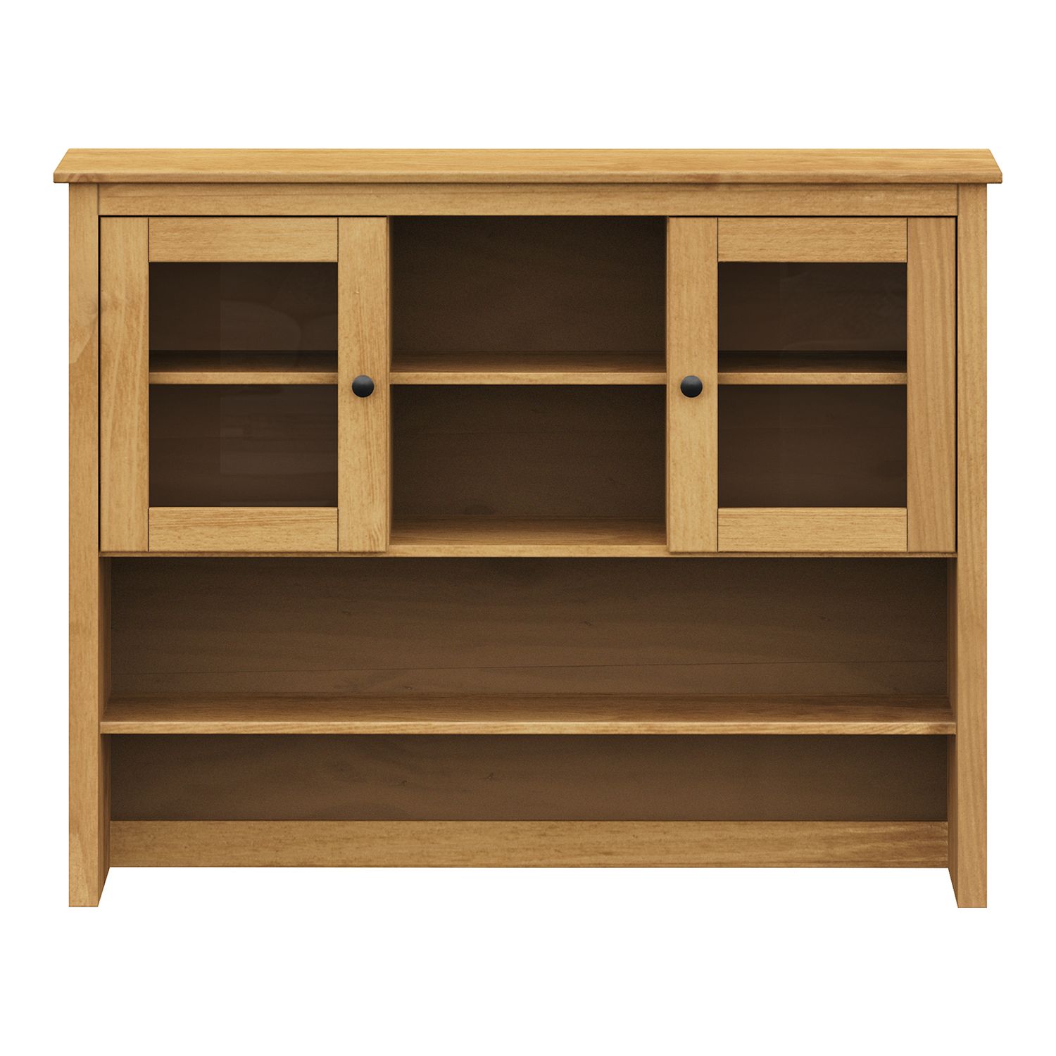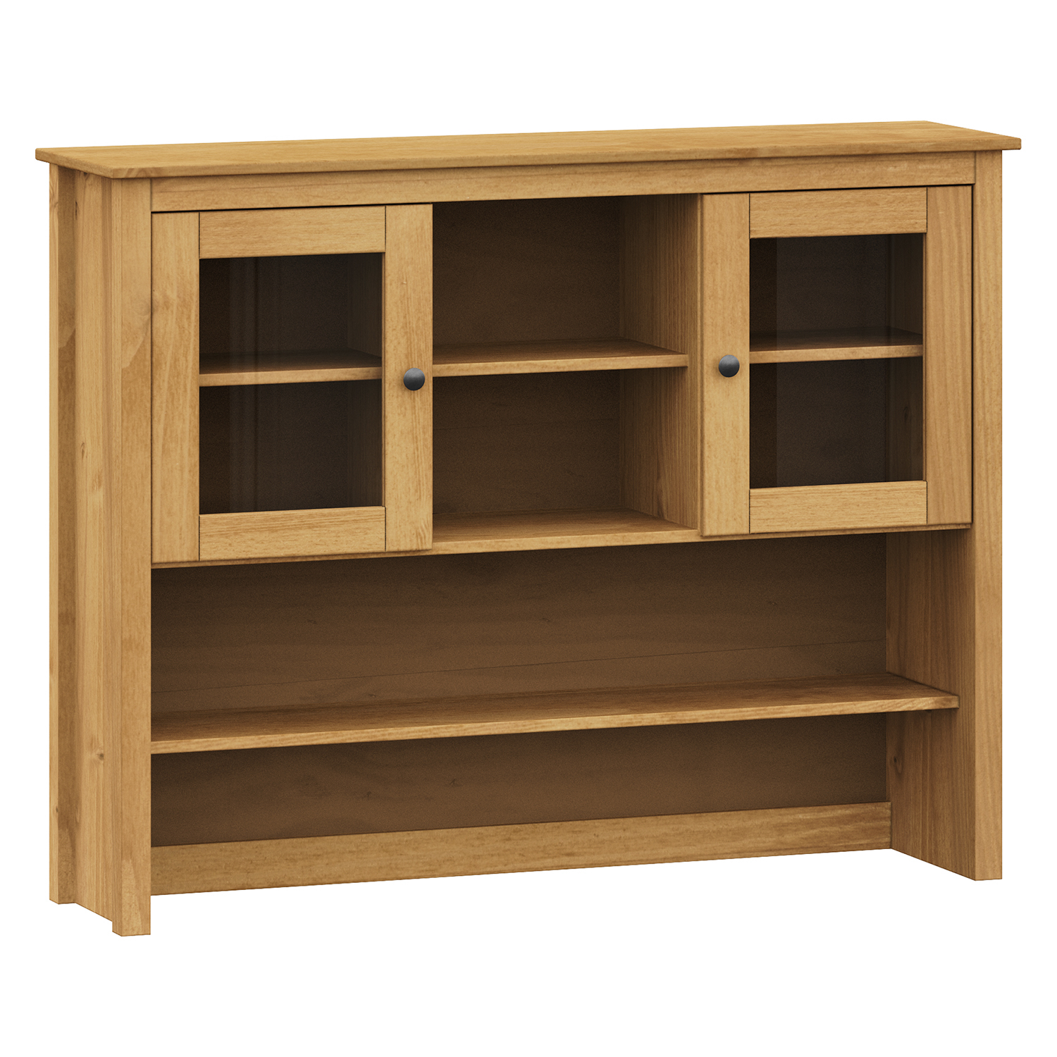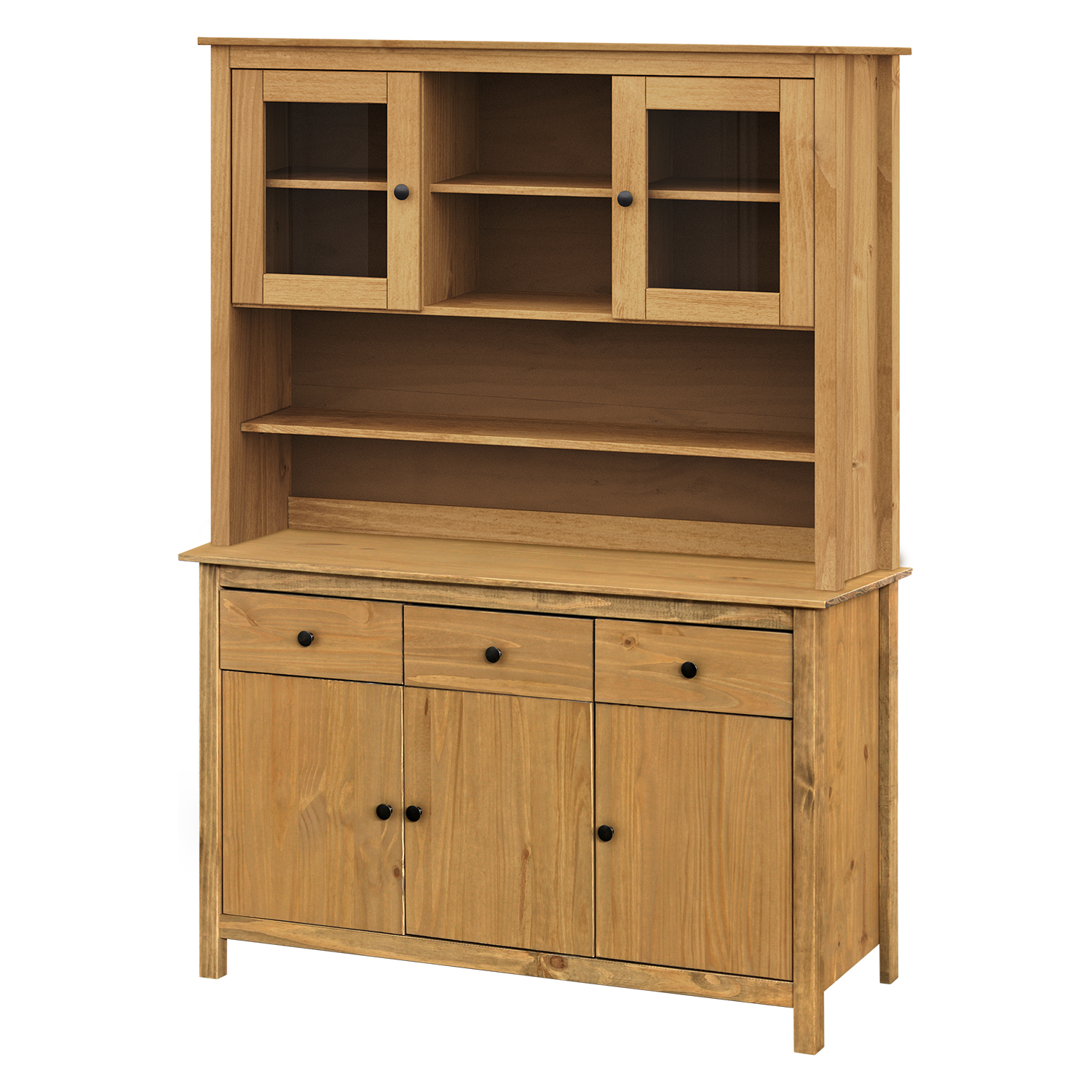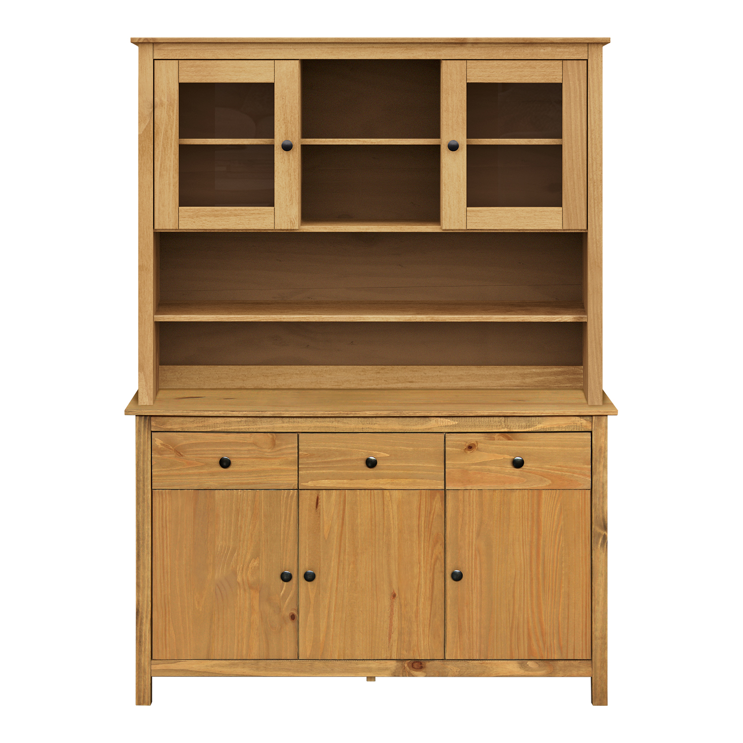 Diese Sideboard-Erweiterung bringt ein Gefühl von handwerklicher Natur und ehrlichem Holz in den Raum. Sie ist aus massiver Kiefer gefertigt, deren gewachste Oberfläche einen warmen Honigton erzeugt und die natürliche Maserung des Holzes bewahrt. Die Wachsbehandlung schützt das Material und sorgt für seine Langlebigkeit. Die beiden Glastüren ermöglichen eine elegante Präsentation von Gläsern, Porzellan oder Dekorationen, während die inneren Einlegeböden praktischen Stauraum bieten. Metallgriffe aus geschwärztem Messing verleihen der Erweiterung einen rustikalen Touch und bilden einen subtilen Kontrast zum Holz. Die Konstruktion ist solide und stabil und lässt die Erweiterung solide und vertrauenswürdig erscheinen. In Verbindung mit dem Sockel-Sideboard bildet das Set eine harmonische und funktionale Einheit. Durch seine zeitlose Optik und hochwertige Verarbeitung eignet es sich für Wohnzimmer, Esszimmer und Küche. Diese Erweiterung ist nicht nur eine praktische Stauraumerweiterung, sondern auch ein Designstück, das die Rolle eines stilvollen Elements in der Einrichtung spielt. Seine ehrliche Verarbeitung und der natürliche Charakter des Holzes können einem Zuhause Wärme, Authentizität und einen Sinn für Ordnung verleihen.