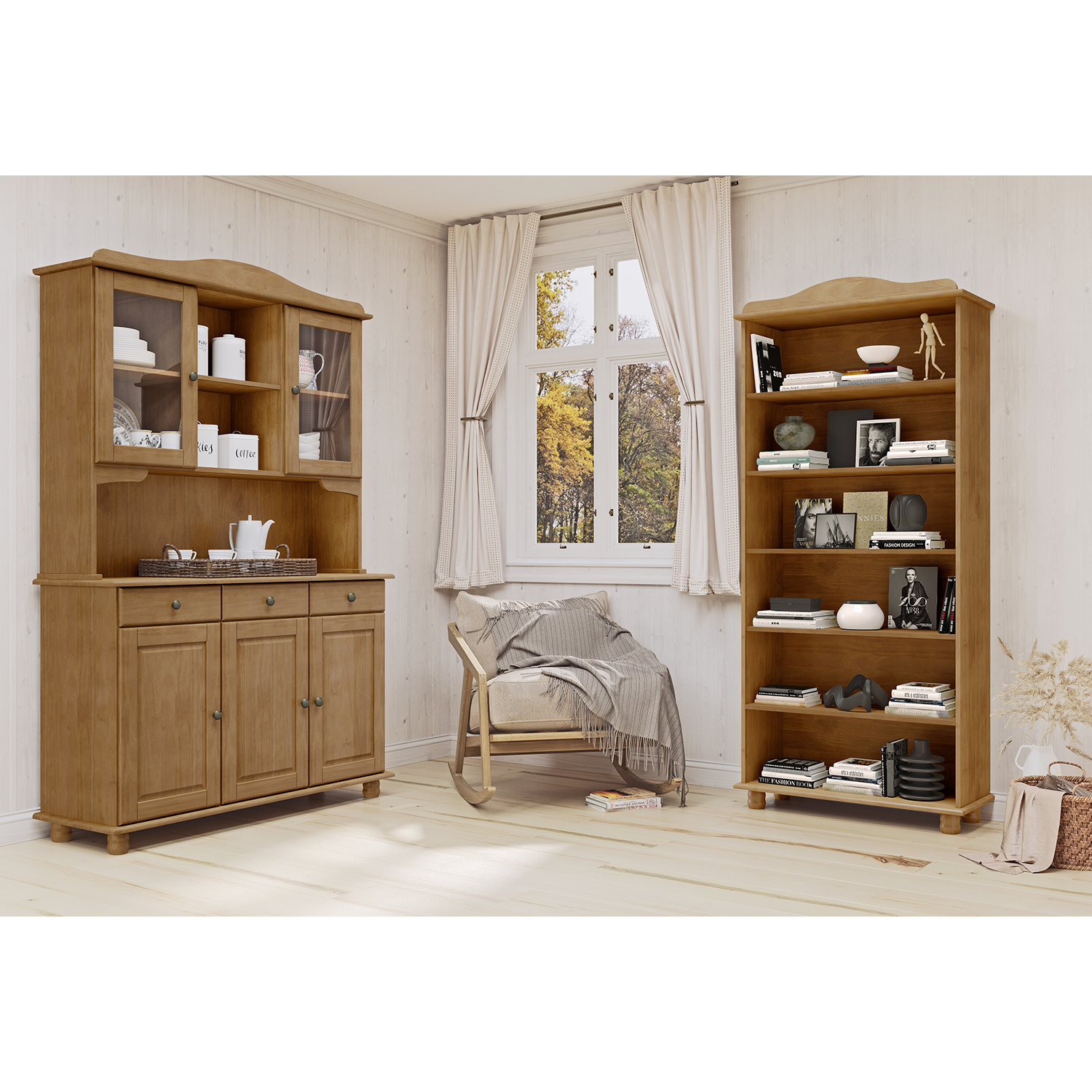 Produktcode: 8928WMaterial Kiefer massiv, lackiert3 Türen im unteren Bereich, 3 Schubladen mit Metallschienenzwei verglaste Türen im oberen Bereich