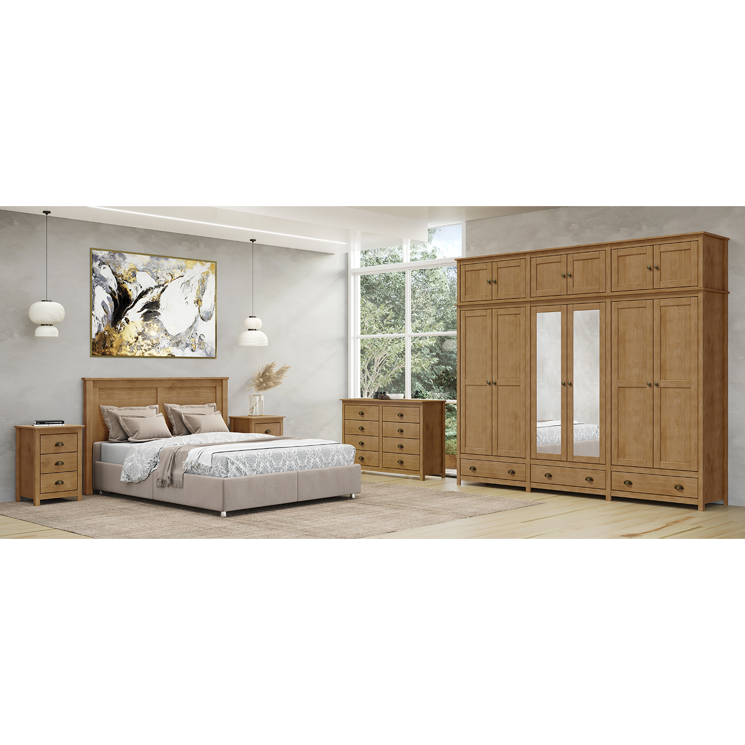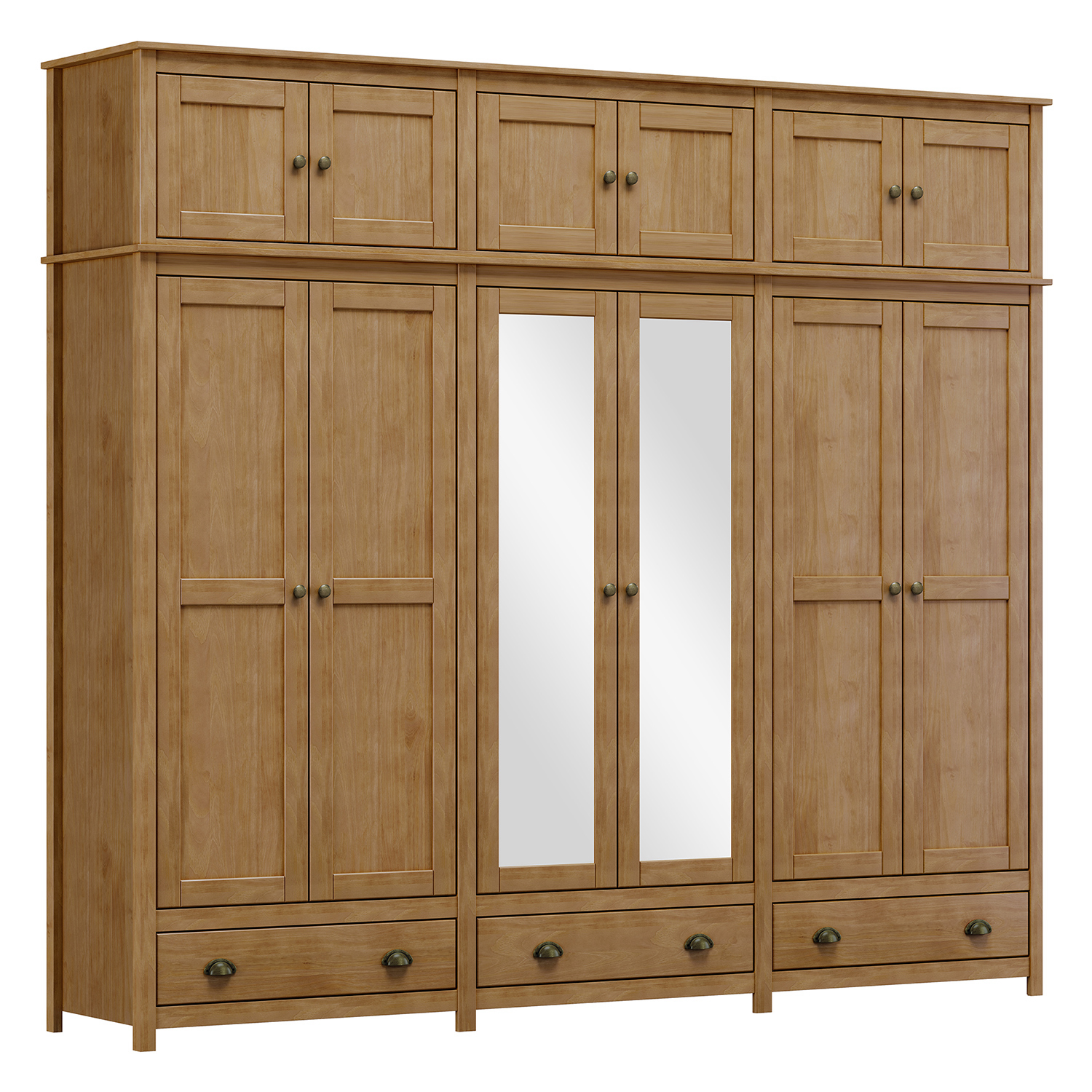 v levé a pravé části 1 police a kovová šatní tyč, ve střední části 3 police, na dvou středních dveřích je zrcadlo