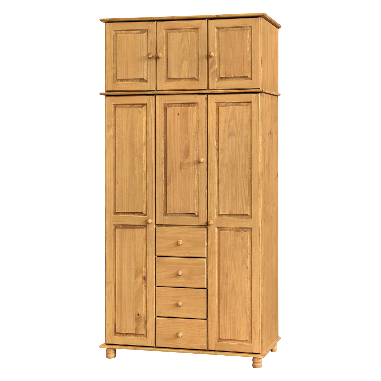 Ein Schrank aus massivem Kiefernholz mit gewachster Oberfläche, der einen Hauch von Natur und Eleganz in Ihr Zuhause bringen wird. Dieses Möbelstück vereint Robustheit und Stil und bietet gleichzeitig eine praktische Raumaufteilung. Der Schrank verfügt über vier Schubladen mit glatten Metallschienen, die einen leichten Zugang und ein problemloses Öffnen ermöglichen. Auf der linken Seite des Schranks befinden sich zwei Garderobenstangen, die sich ideal für die Organisation von Kleidung aller Größen eignen. In der Mitte befindet sich ein geräumiger Einlegeboden, auf dem gefaltete Kleidung oder Accessoires aufbewahrt werden können. Der rechte Teil bietet drei Einlegeböden, die viel Platz für Ihre Sachen bieten. Um den Platz optimal zu nutzen, empfehlen wir die Erweiterung 8864V, die diesen vielseitigen Schrank perfekt ergänzt. Investieren Sie in Qualität und Eleganz mit diesem Kleiderschrank aus massivem Kiefernholz, der Ihre Einrichtung verschönert und eine praktische Lösung für den täglichen Bedarf bietet.