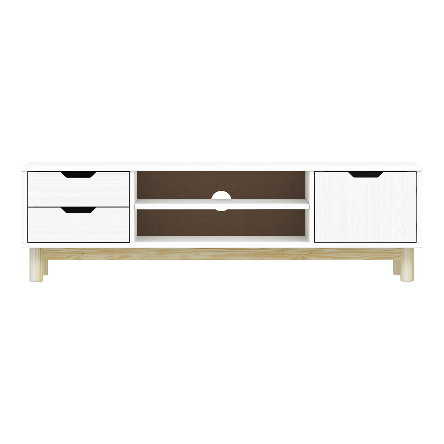 Material Kiefer massiv, lackiert2 Schubladen mit Metallschienen, 1 Tür, 1 EinlegebodenLoch für Kabeldurchführung