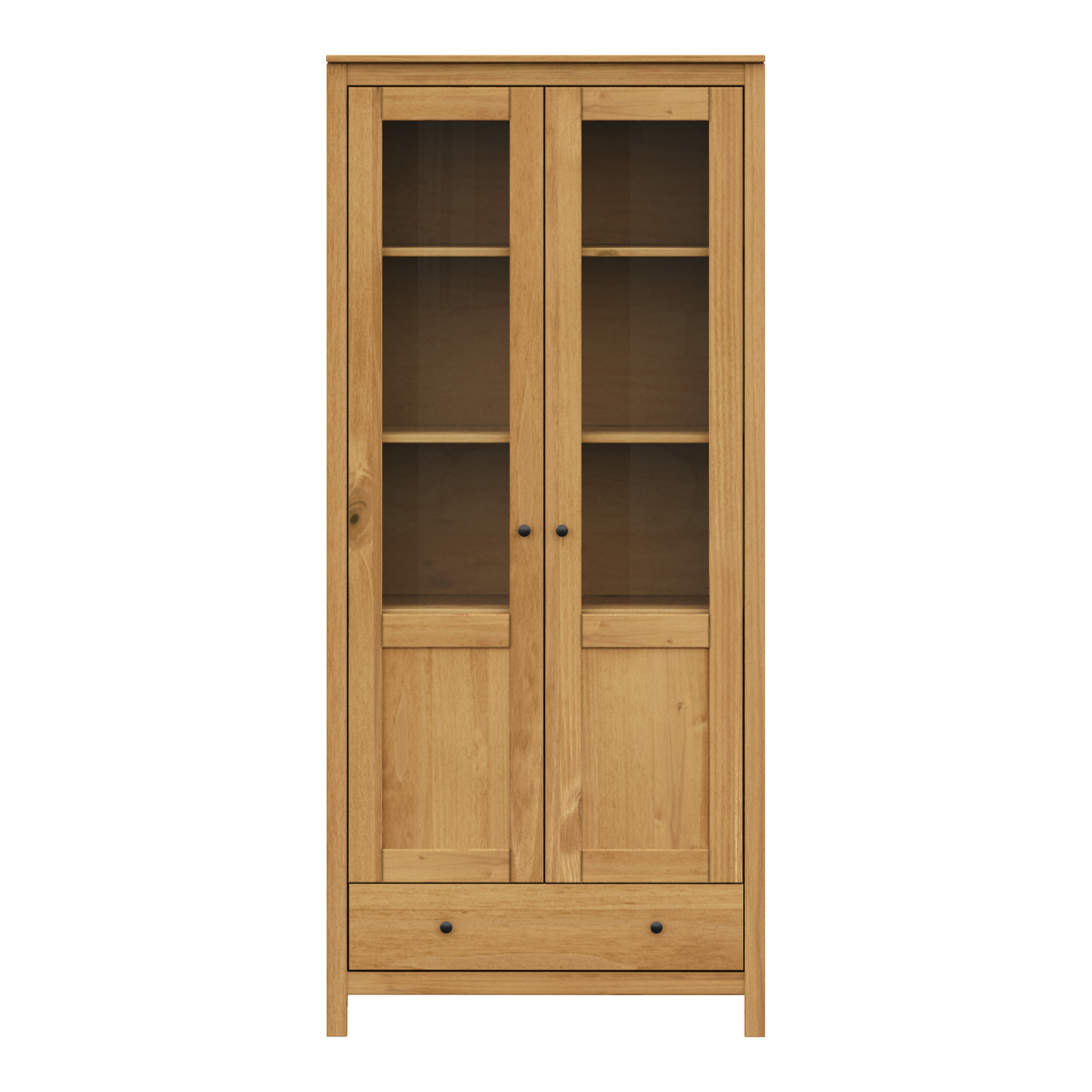 Produktcode: 8060Vmateriál masiv borovice voskovaná v medovém odstínu kovové úchytky v barevném provedení černěná mosaz 2 prosklené dveře, 2 police maximální nosnosti uvedeny v návodu k montáži