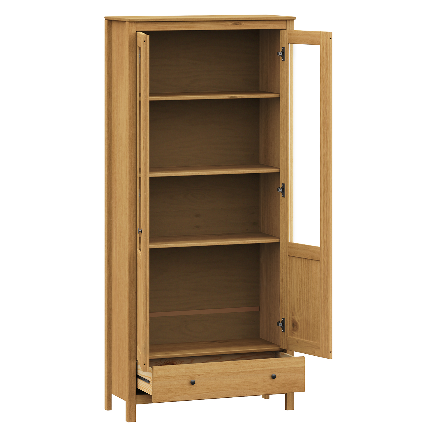Produktcode: 8077VMaterial massives Kiefernholz gewachst in Honigton Metallgriffe aus geschwärztem Messing zwei teilweise verglaste Türen, vier Einlegeböden